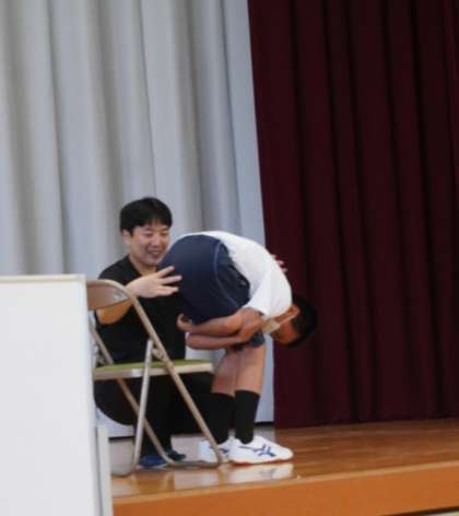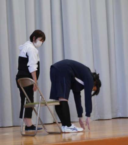 前屈がもっとできるようになる運動を、代表生徒にやってもらいました。