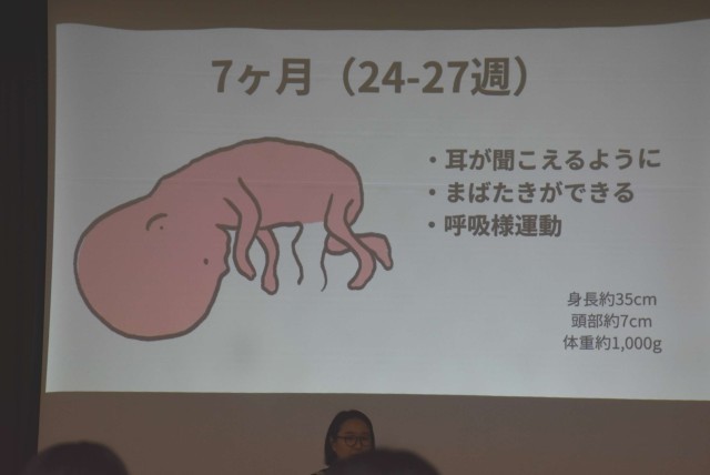 最初、全員で助産師さんによる講義「いのち」を受講しました。命がどうやって授かって、どうやって生まれてくるのかをご講義いただきました。
