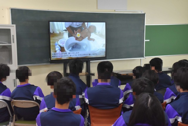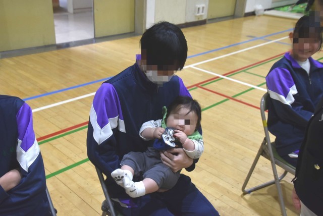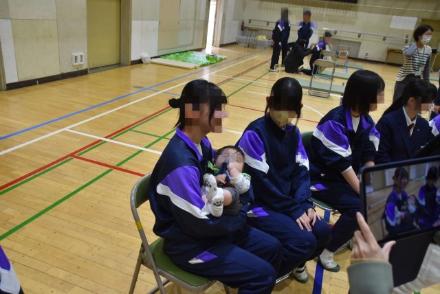 やはり目玉は「赤ちゃん抱っこ体験」で、生徒たちは「かわいい〜!」と言いながらも「こわごわ」抱っこをしていました。