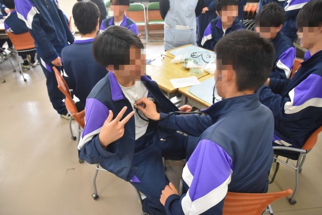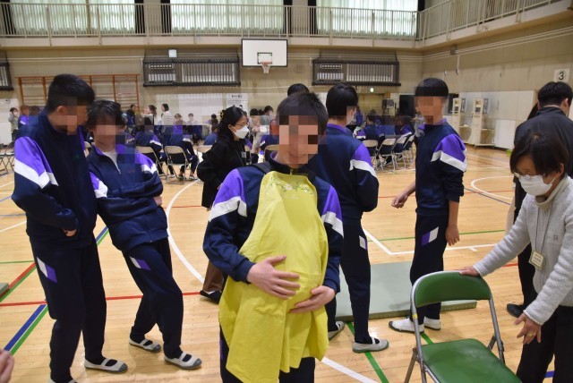 その後、グループに分かれて、「「赤ちゃん抱っこ体験」「妊婦体験」「心音を聞く体験」「動画視聴」の体験活動を行いました。