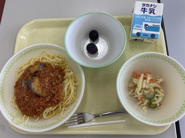 今日のメニューは、町田産なす入りミートソーススパゲティ、シャキシャキポテトサラダ、ぶどう、牛乳です。