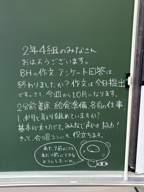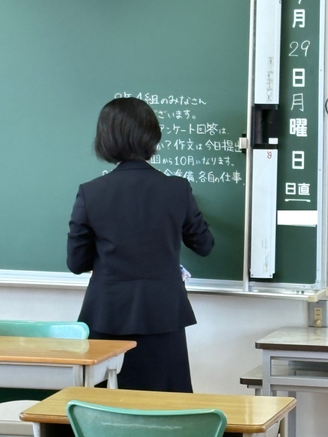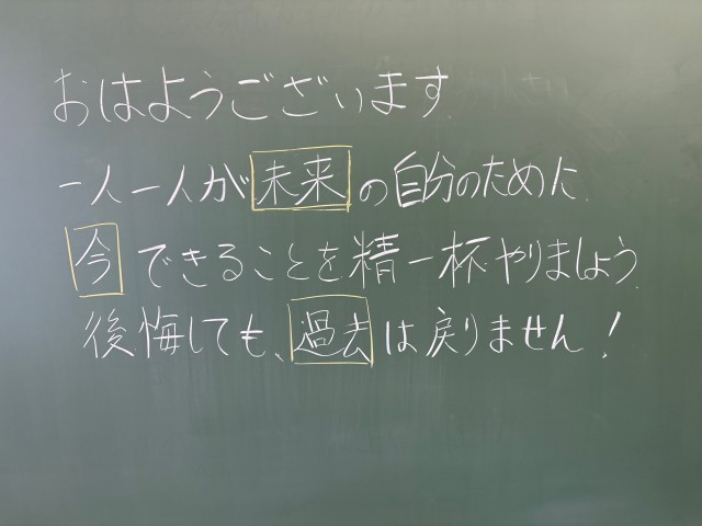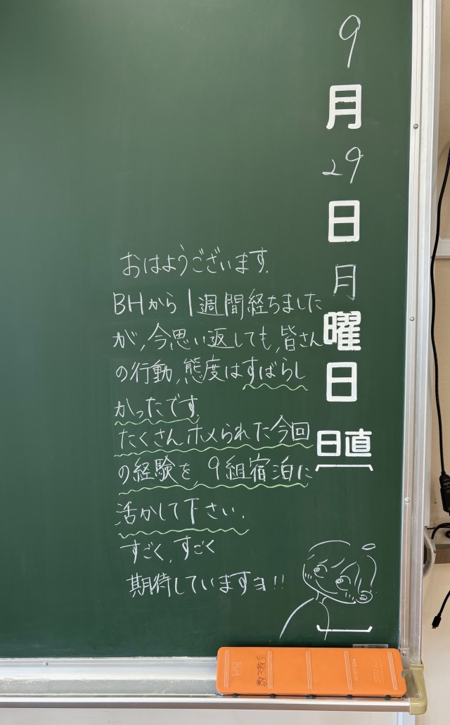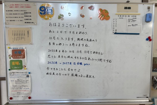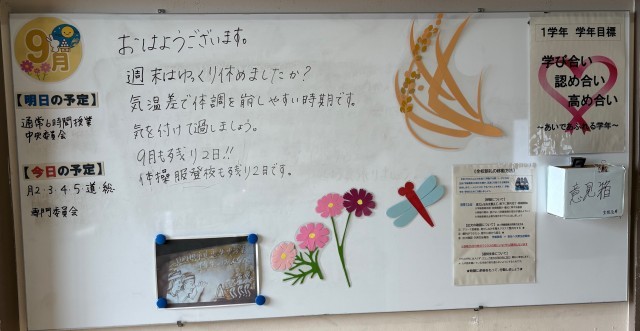 9月29日(月)の朝に校舎内を巡回していたら、学年主任や学級担任の先生からのメッセージが書いてありました。