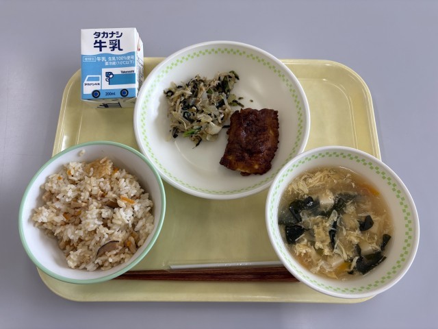 今日の給食のメニューは、高野豆腐のそぼろごはん、牛乳、いかのさらさ揚げ、磯香和え、むらくも汁です。高野豆腐のそぼろごはんといかのさらさ揚げが美味しかったです。ご馳走さまでした。