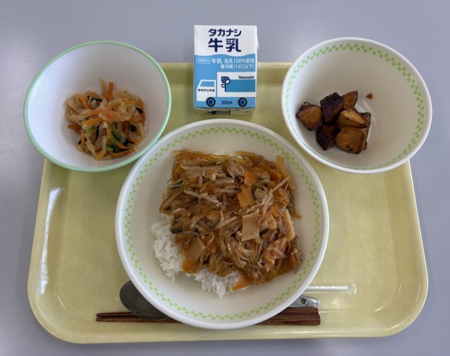 今日の給食のメニューは、テジプルコギ丼、牛乳、大学いも、ナムルです。テジプルコギ丼が美味しかったです。ご馳走様でした。