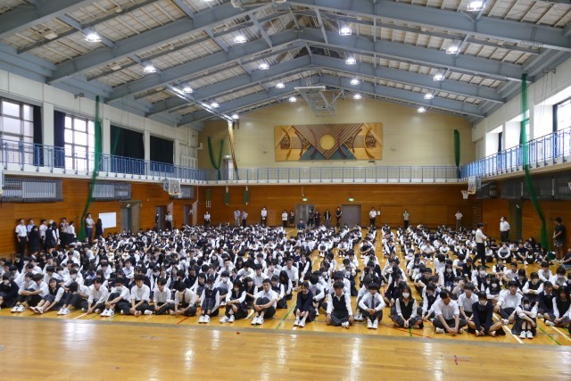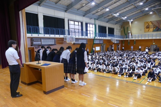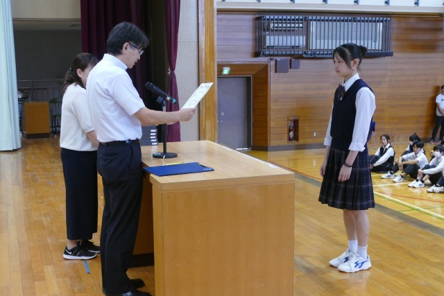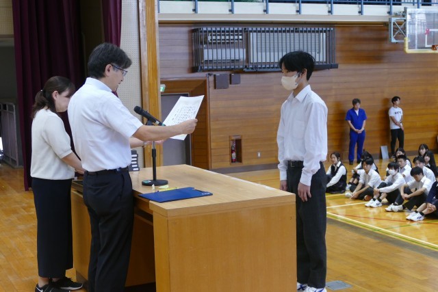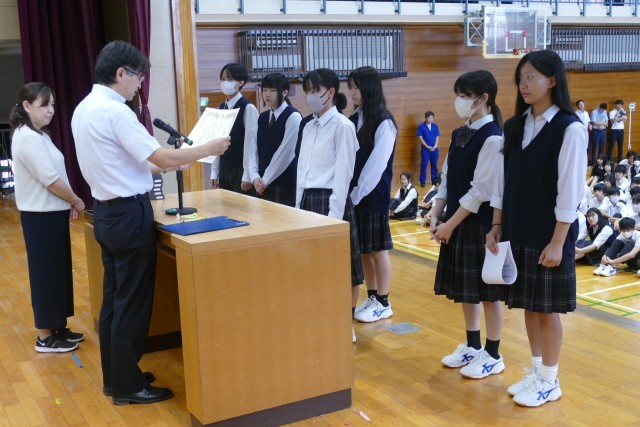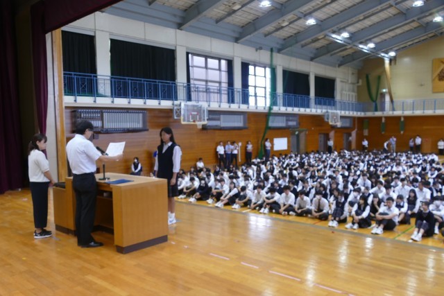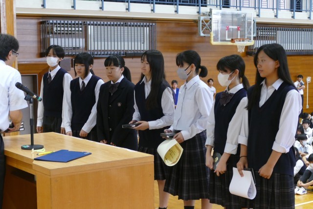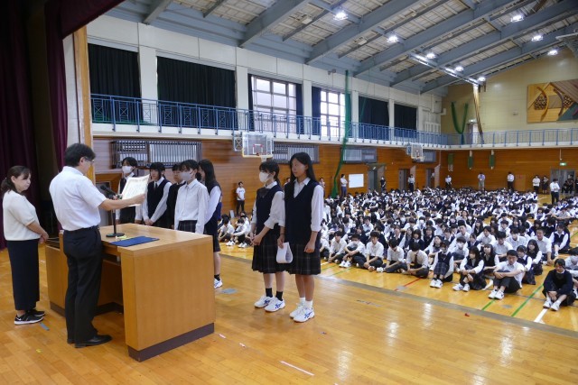 全校朝礼の最後に、各部活動の表彰を行いました。卓球部、バドミントン部、剣道部のみなさんがステージで表彰されました。全校生徒のみなさんも、大きな拍手でお祝いしています。おめでとうございます。