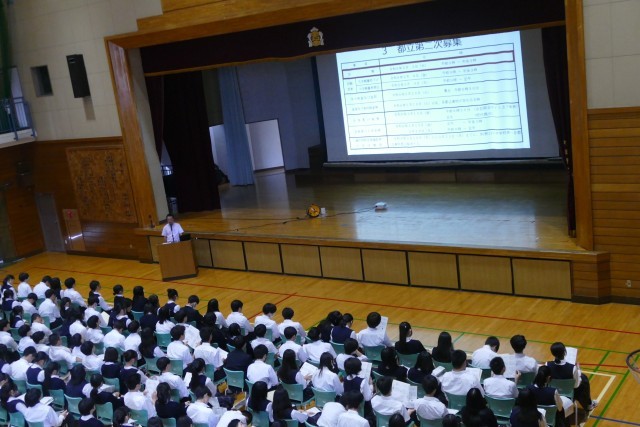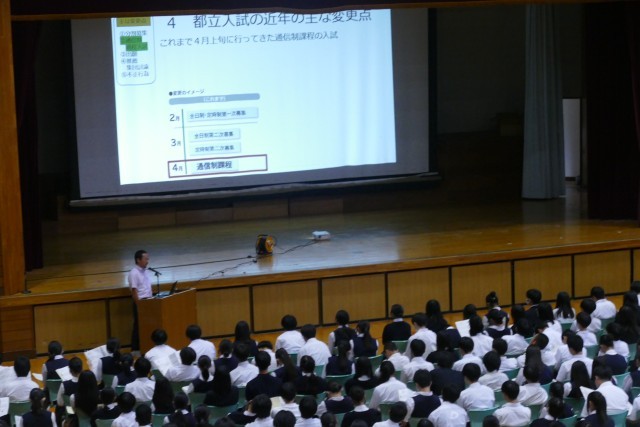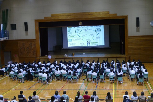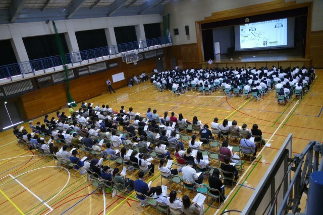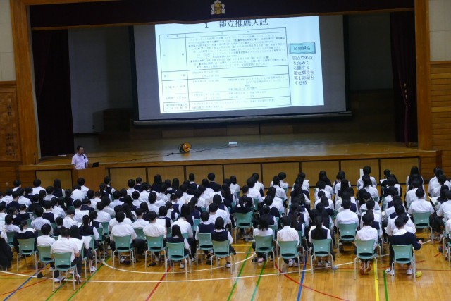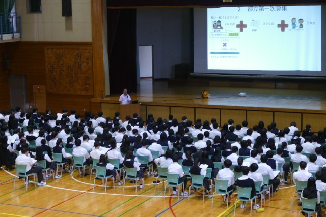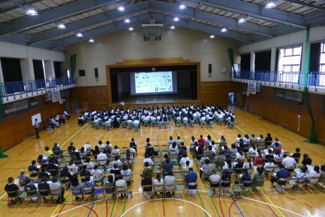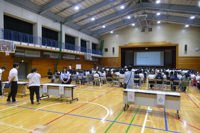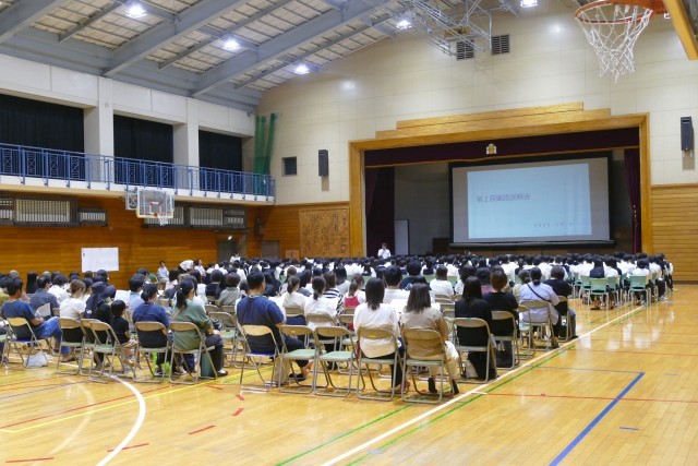 10月6日(月)午後2時30分からアリーナで、第2回進路説明会を行いました。3年生のみなさんと100名以上の保護者の方々が参加しました。はじめに校長先生からご挨拶があり、次に進路指導主任の荒井先生から、詳しい説明がありました。3年生のみなさんは、真剣にお話を聞いていました。