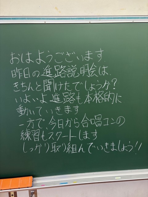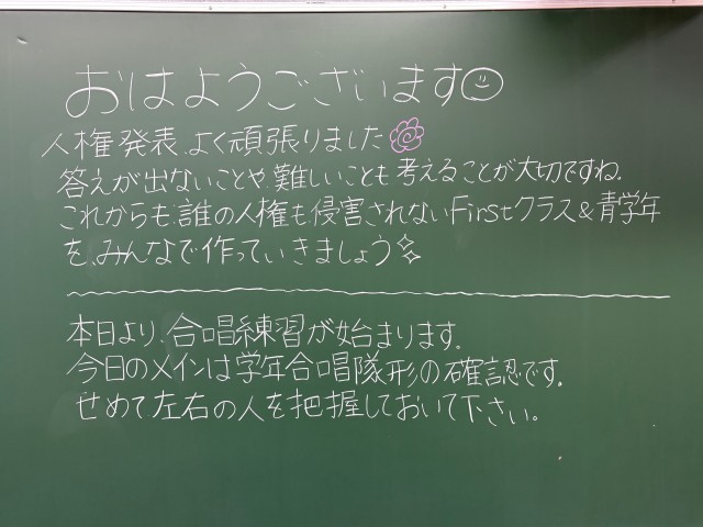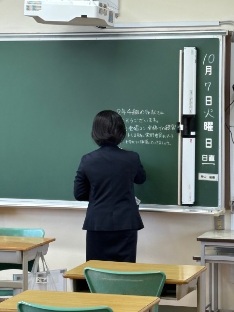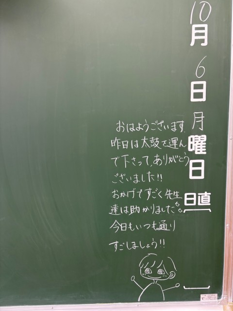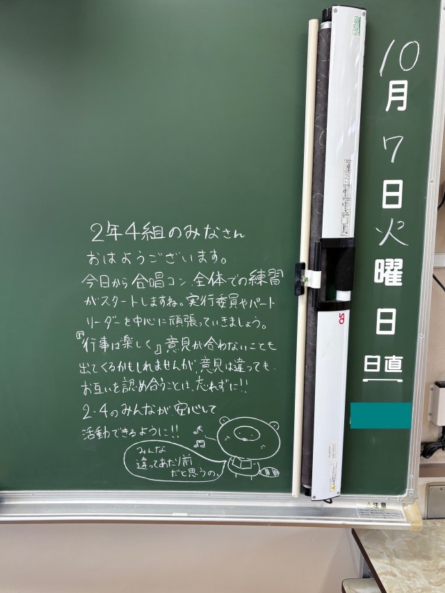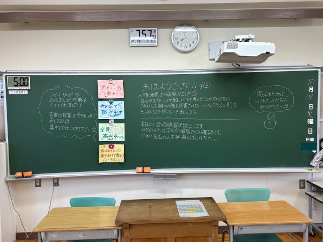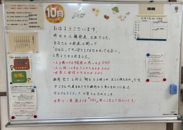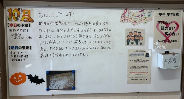 10月7日(火)の朝に校舎内を巡回していたら、学年主任や学級担任の先生からのメッセージが書いてありました。