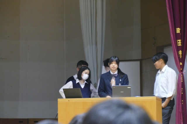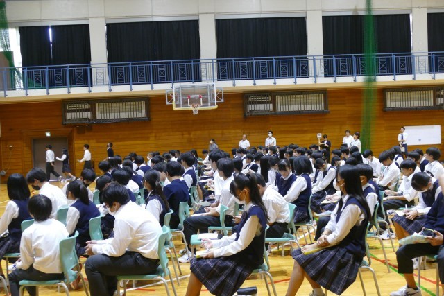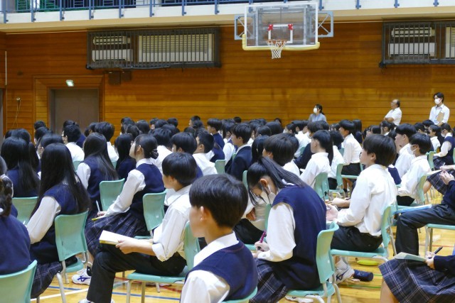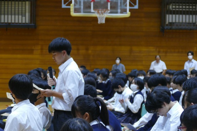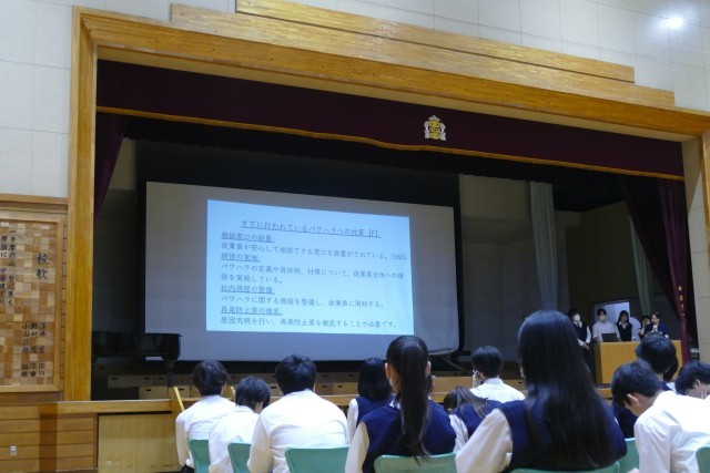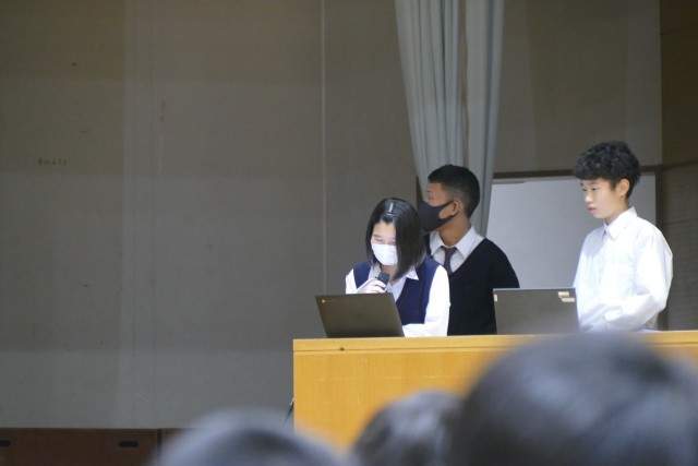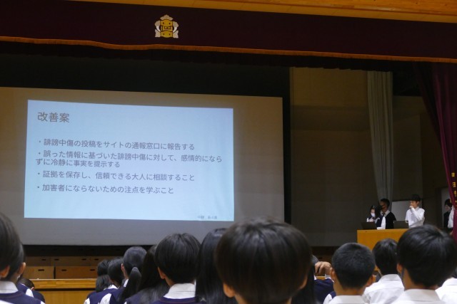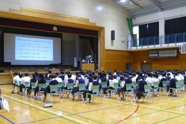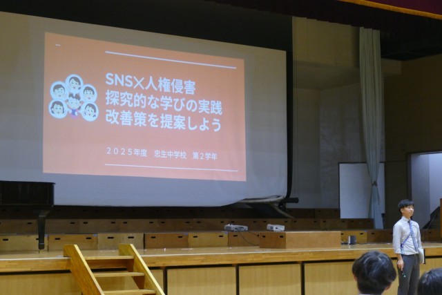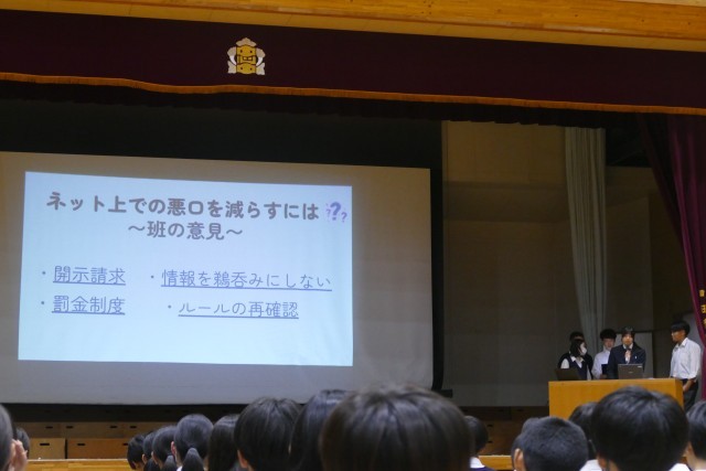10月8日(水)5校時にアリーナで研究授業を行いました。2年生のみなさんが「インターネットによる人権侵害」をテーマに、SNSによる人権侵害の改善策についての考えを提案しました。生徒のみなさんは、一生懸命に授業に取り組んでいました。