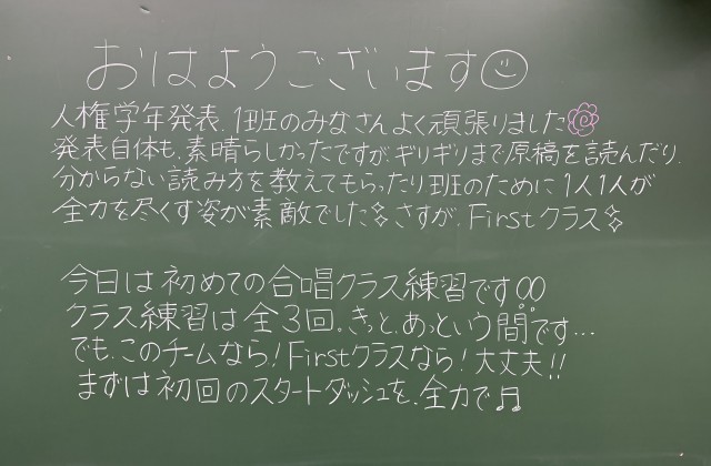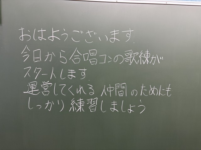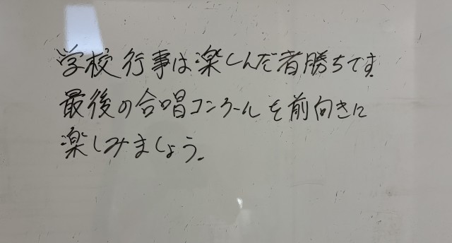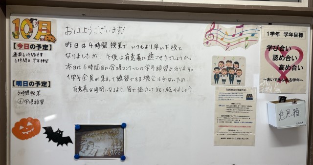 10月9日(木)の朝に校内を巡回していたら、学年主任や学級担任の先生方からのメッセージが書いてありました。
