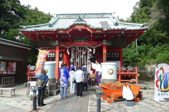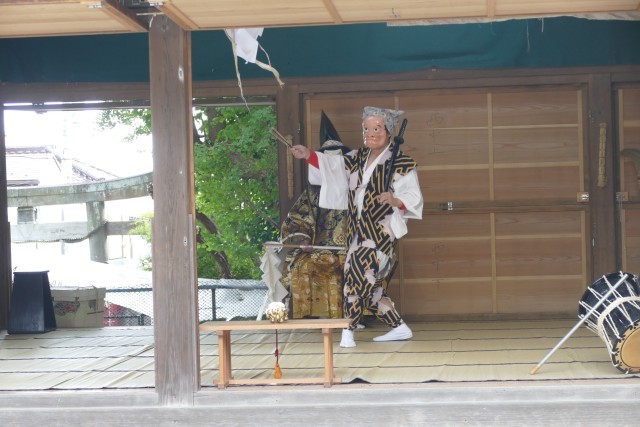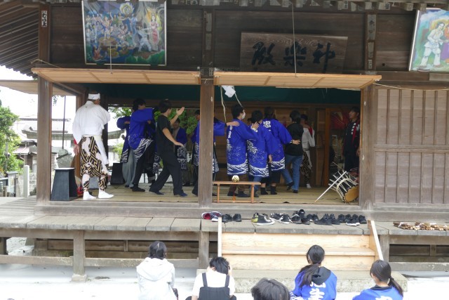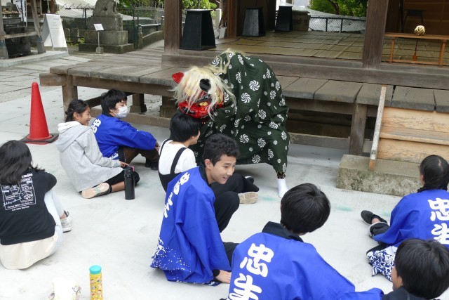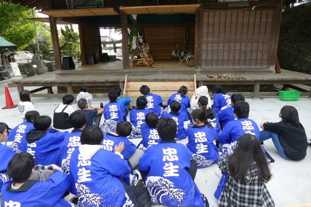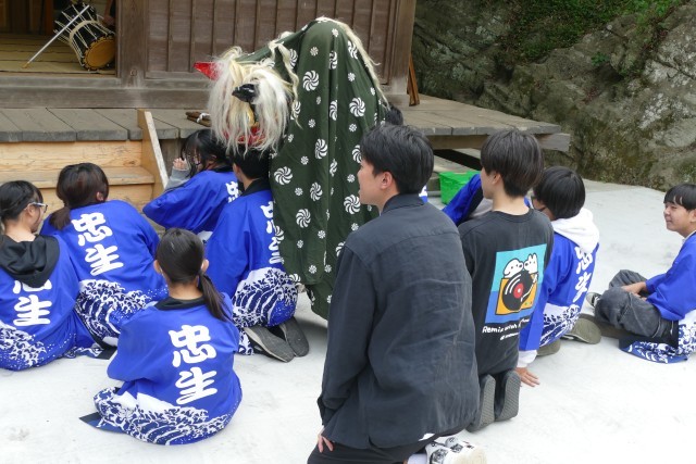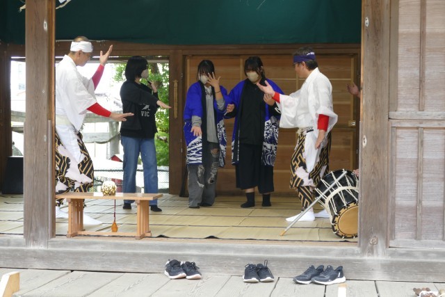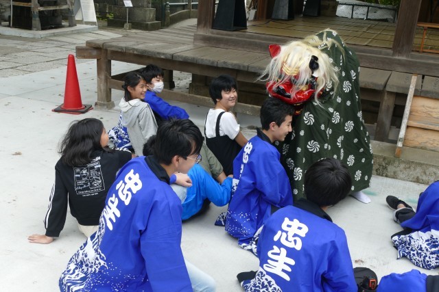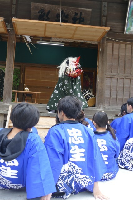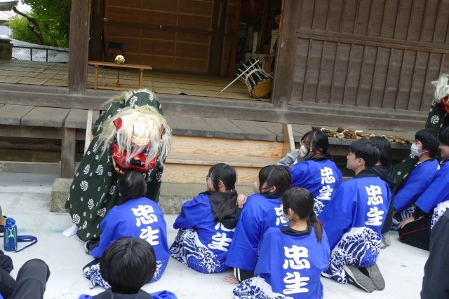 はじめに神楽体験活動を行いました。獅子舞も厄落としに来ました。生徒のみなさんは、楽しそうです。その後、神楽の踊りを体験しました。