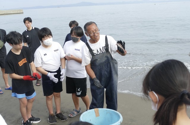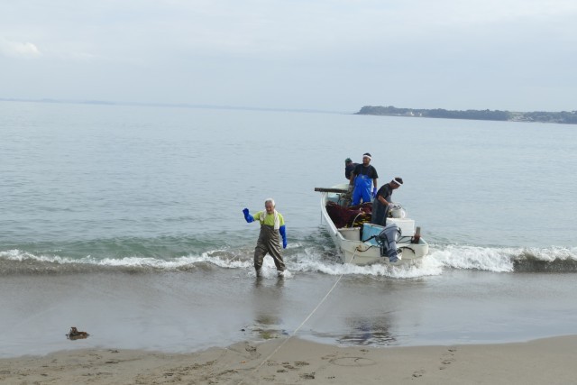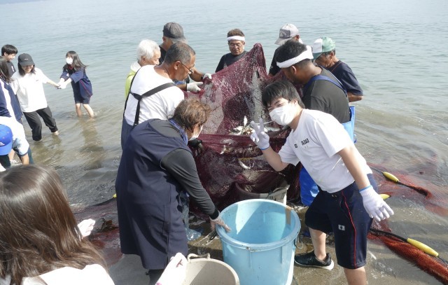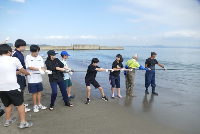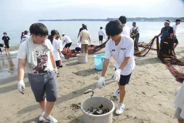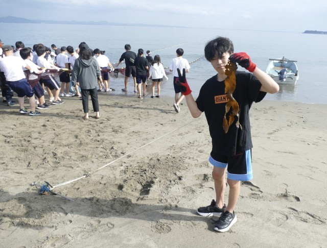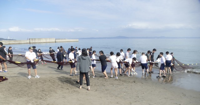 10月10日(金)午後2時30分から三和漁港で地引網体験をしました。生徒のみなさんは、二つのグループに分かれて、協力して地引網を引っ張りました。たくさんのお魚が獲れて、生徒のみなさんは大喜びです。地引網を指導してくださいました三和漁業協同組合の皆様、貴重な体験をありがとうございました。