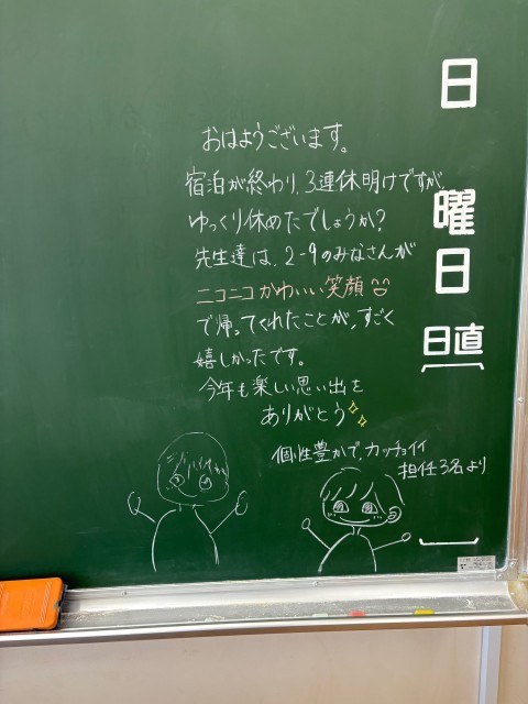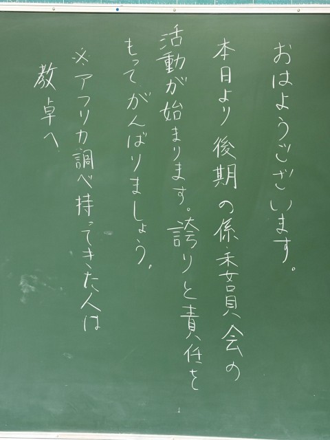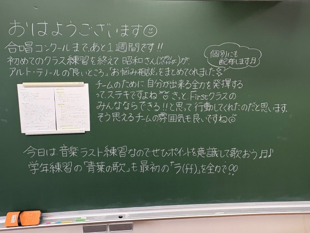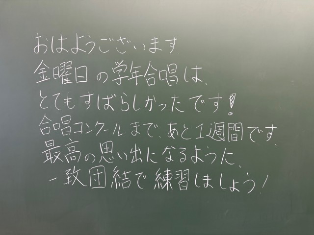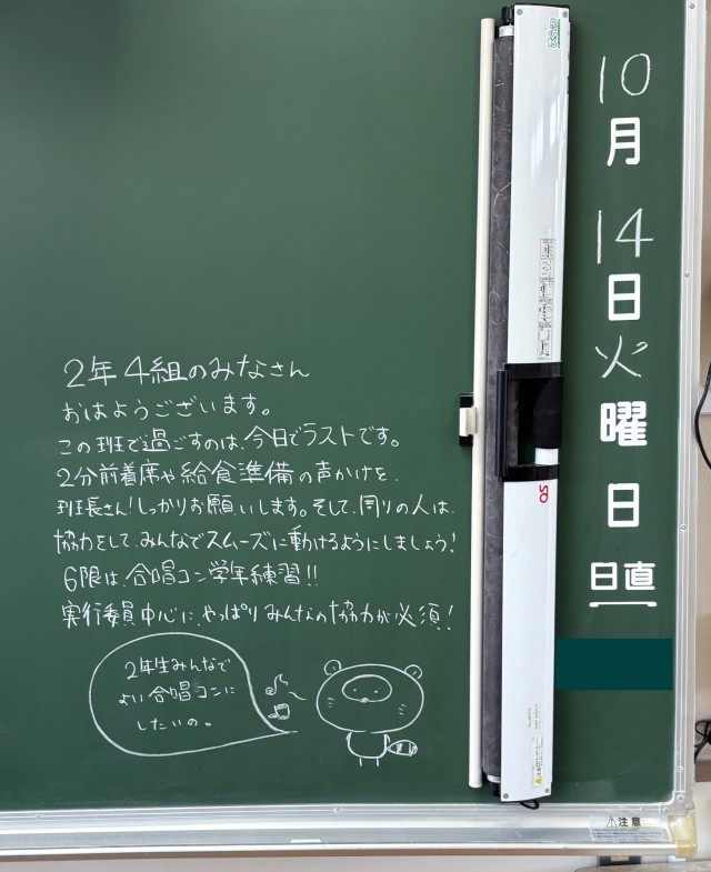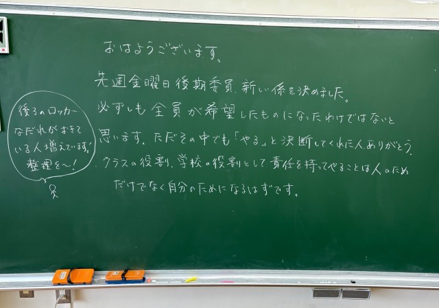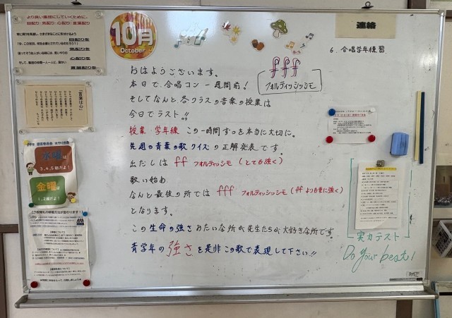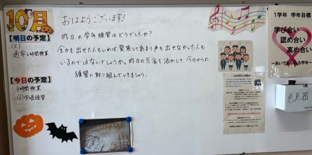 10月14日(火)の朝に校舎内を巡回していたら、学年主任や学級担任の先生からのメッセージが書いてありました。