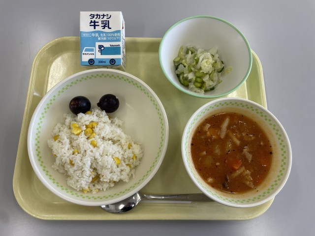今日のメニューは、バターコーンピラフ、鶏肉とじゃがいものトマト煮込み、グリーンサラダ、ぶどう、牛乳です。