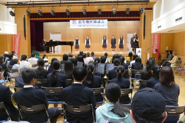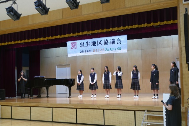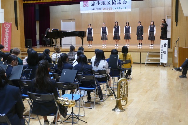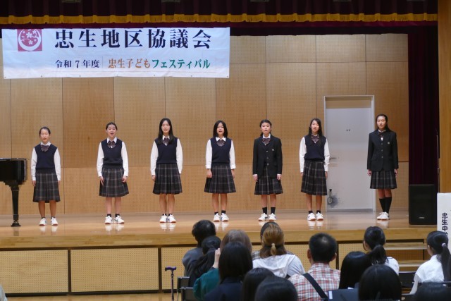 忠生子どもフェスティバルに合唱部のみなさんが出演しました。中山先生の伴奏で「海の見える街」「生まれてはじめて」「心の地図」「僕らは生き物だから」の4曲を歌いました。きれいなハーモニーが会場に響きました。素晴らしい合唱に、会場からは大きな拍手が鳴り響きました。当日は、朝早くから音楽室で中山先生と芝合先生の指導のもと、真剣に練習に取り組んでいました。合唱部のみなさん、素敵な合唱をありがとうございました。