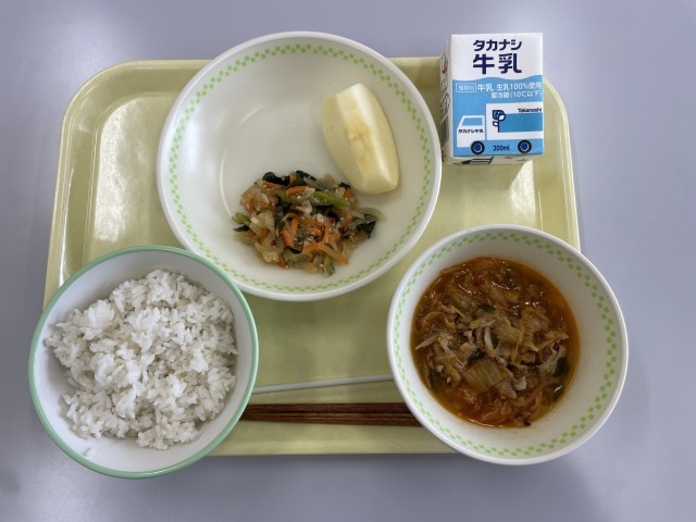 今日のメニューは、麦ごはん、豚キムたく炒め、華風和え、りんご、牛乳です。