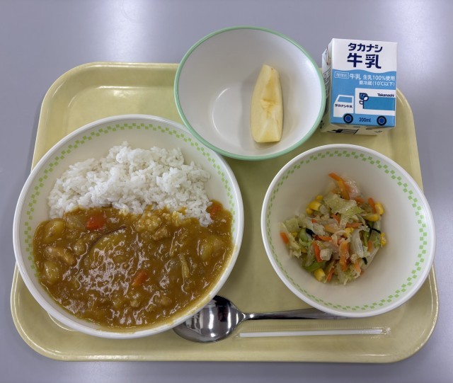 11月10日(月)の給食 公開日 2025/11/10 更新日 2025/11/10 今日の給食 今日の給食のメニューは、秋野菜のカレーライス、牛乳、町田産キャベツの柚子ドレサラダ、リンゴです。秋野菜のカレーライスが美味しかったです。