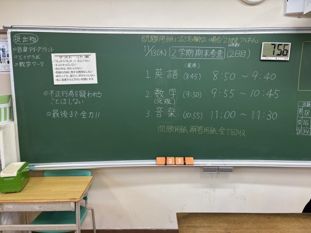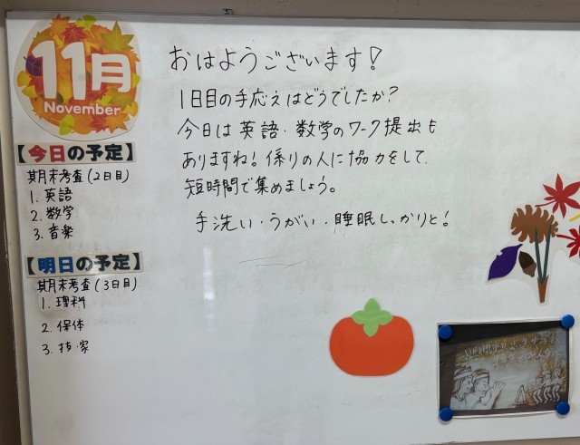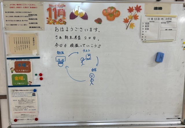 11月13日(木)の朝に校舎内を巡回していたら、学年主任や学級担任の先生からのメッセージが書いてありました。