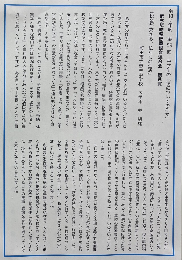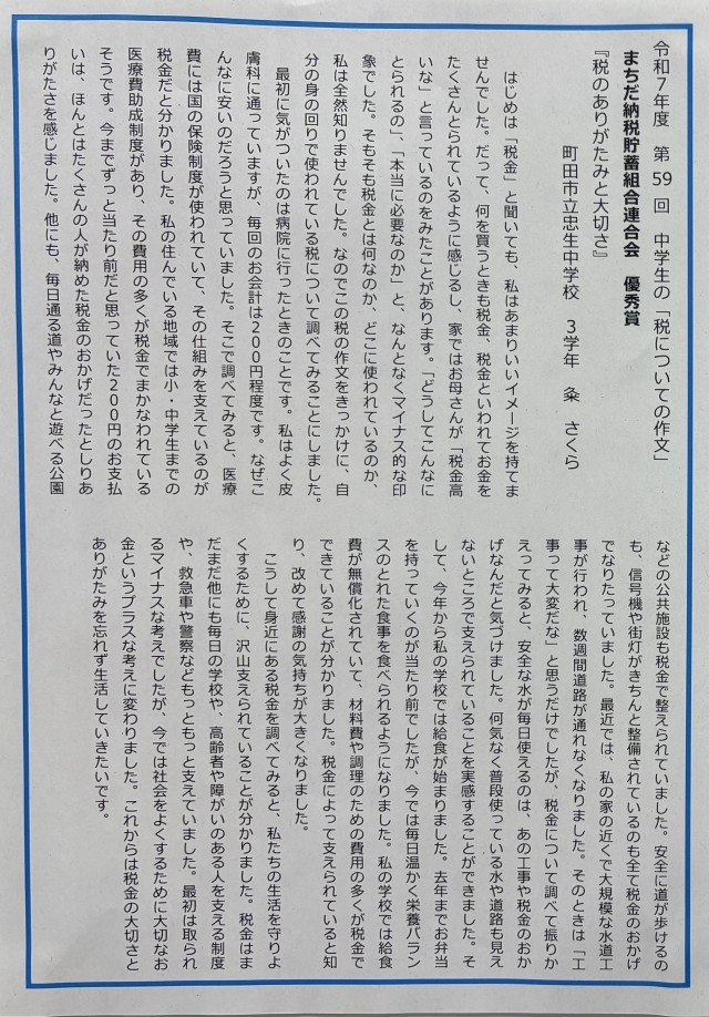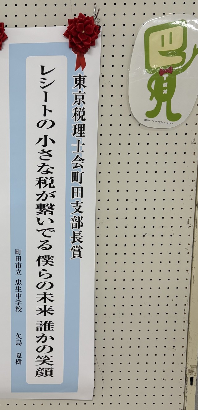 11月9日(日)から11月14日(金)まで、町田市庁舎1階で「税の作品展」を開催しています。この作品展は、毎年、「税を考える週間」にあわせて、4つのコンクール(作文、標語、絵はがき、書道)のうち、優秀賞を受賞した一部を展示しています。忠生中学校の生徒の作品も展示したありました。素晴らしい標語、作文に感動しました。受賞した生徒のみなさん、おめでとうございます。