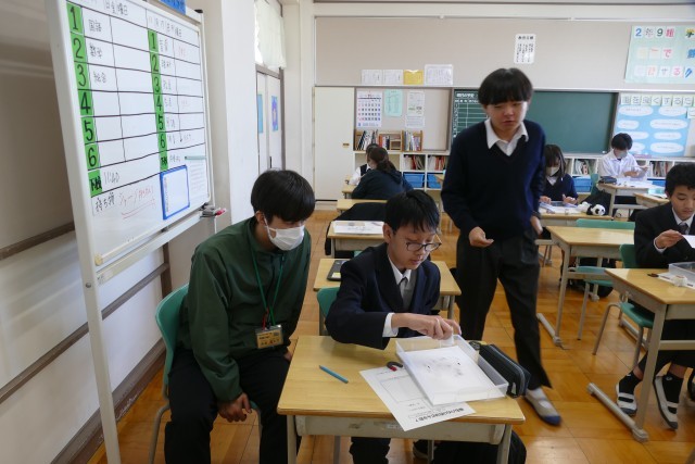 11月17日(月)の2校時に2年9組の教室で理科の授業が行われていました。「磁石の力の形」の実験をしていました。生徒のみなさんは集中して授業に取り組んでいました。