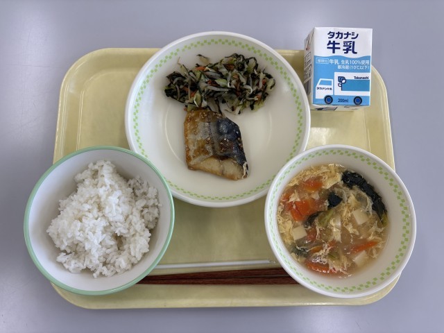 11月17日(月)の給食 公開日 2025/11/17 更新日 2025/11/17 今日の給食 今日の給食のメニューは、ごはん、牛乳、さばのごまみそだれ、町田産キャベツののり和え、むらくも汁です。さばのごまみそだれがとても美味しかったです。ご馳走さまでした。