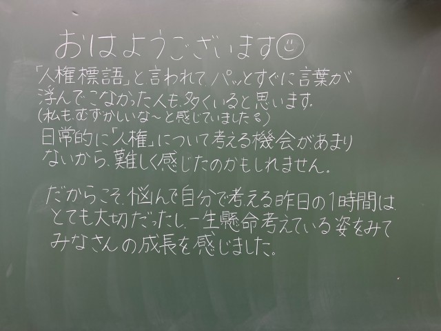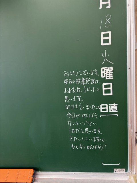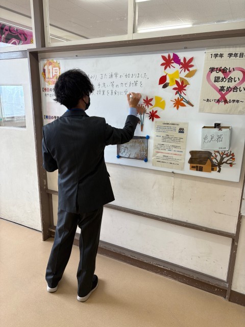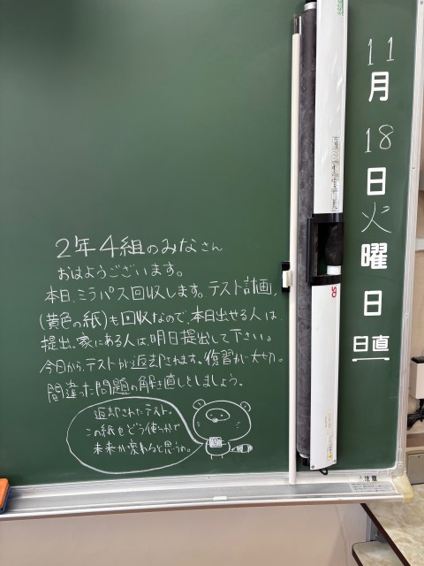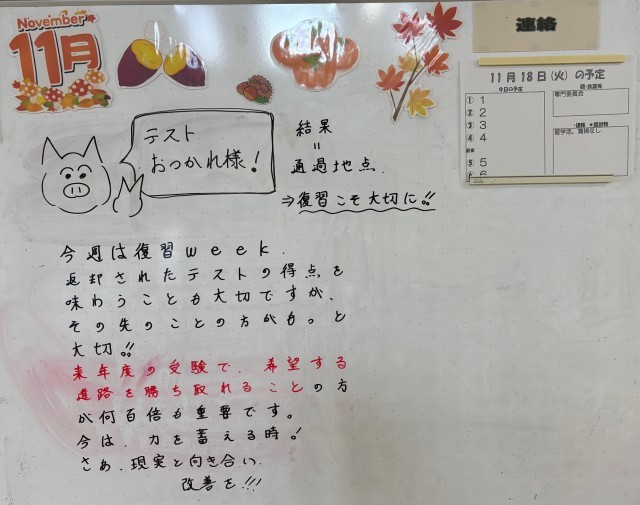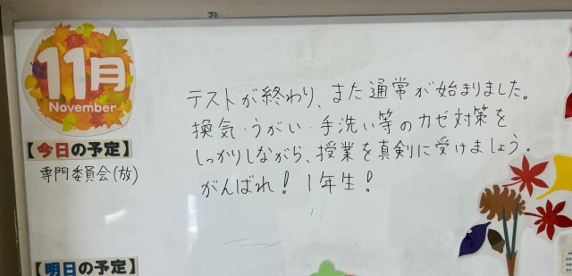 11月18日(火)の朝に校舎内を巡回していたら、学年主任や学級担任の先生からのメッセージが書いてありました。