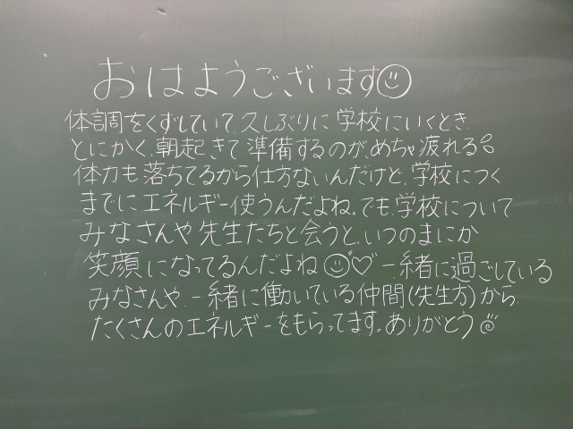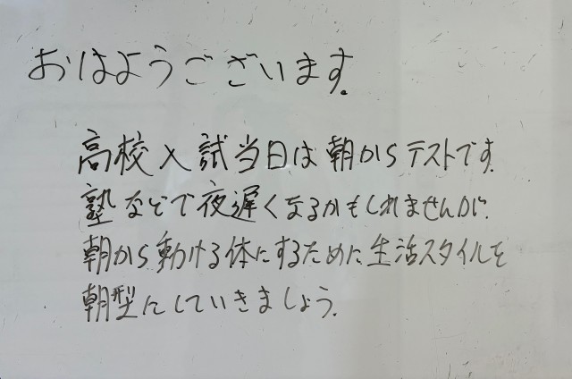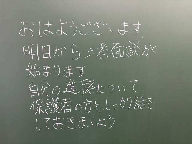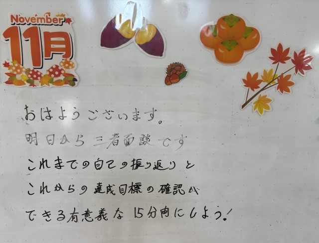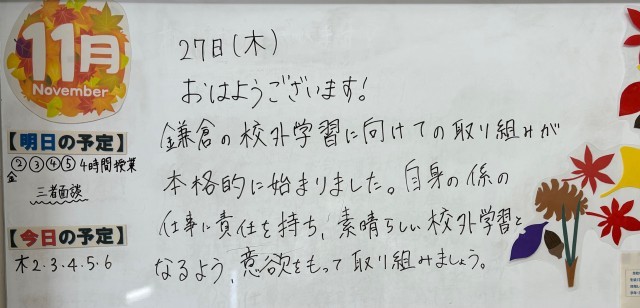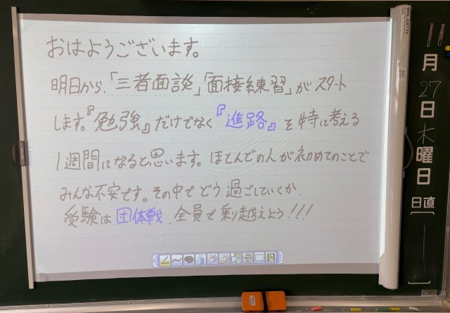 11月27日(木)の朝に校舎内を巡回していたら、学年主任や学級担任の先生からのメッセージが書いてありました。