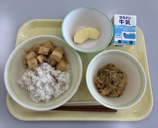 12月1日(月)の給食 公開日 2025/12/01 更新日 2025/12/01 今日の給食 今日の給食のメニューは、麦入りご飯、牛乳、生揚げの肉みそだれ、五目炒め、リンゴです。生揚げの肉みそだれと五目炒めが美味しかったです。ご馳走さまでした。