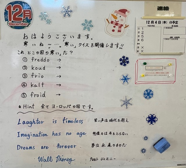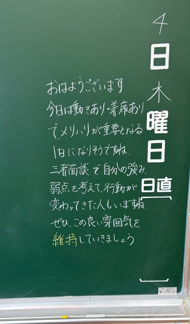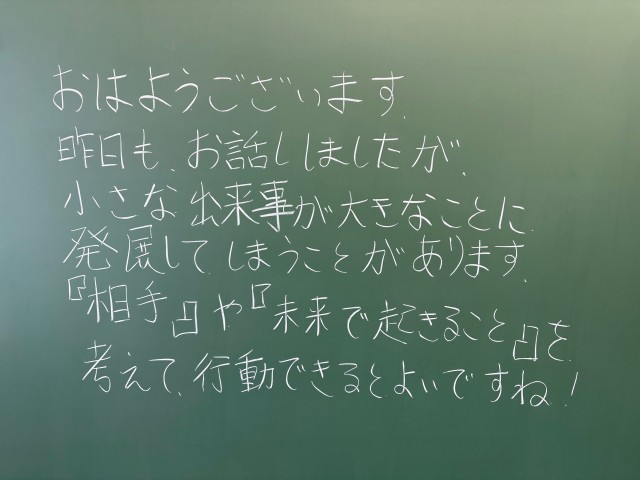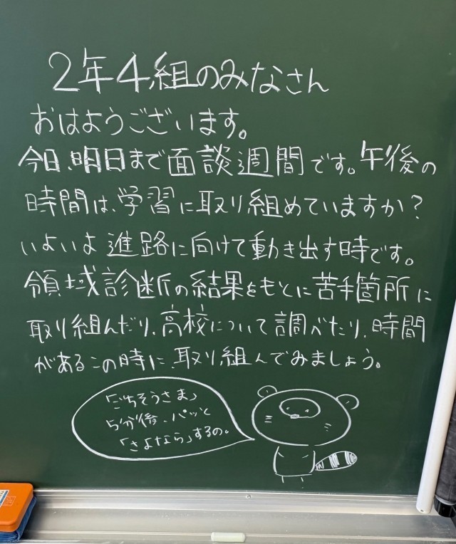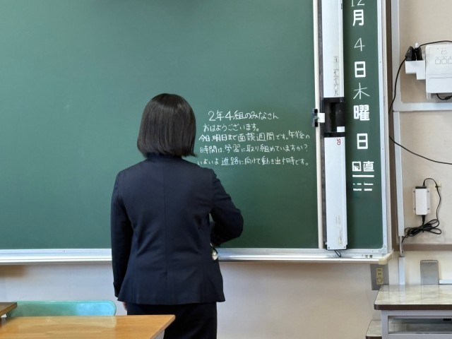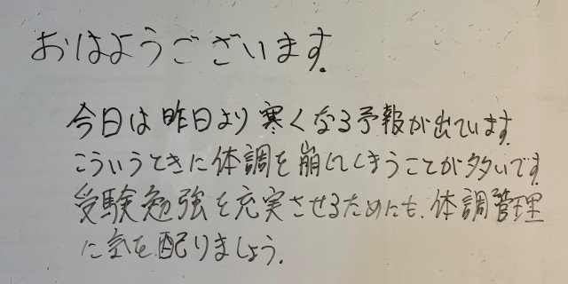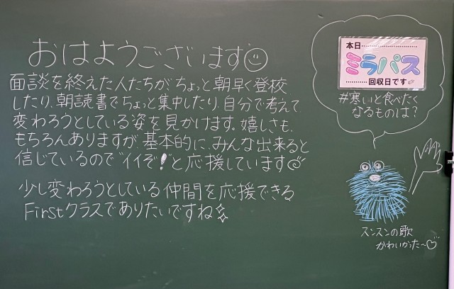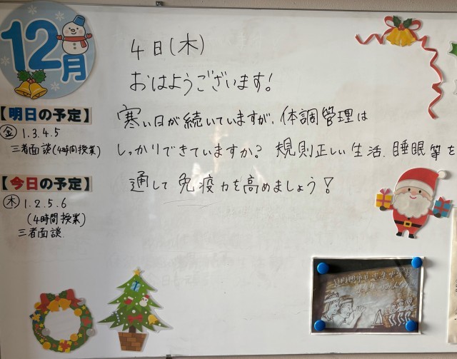 12月4日(木)の朝に校舎内を巡回していたら、学年主任や学級担任の先生からのメッセージが書いてありました。