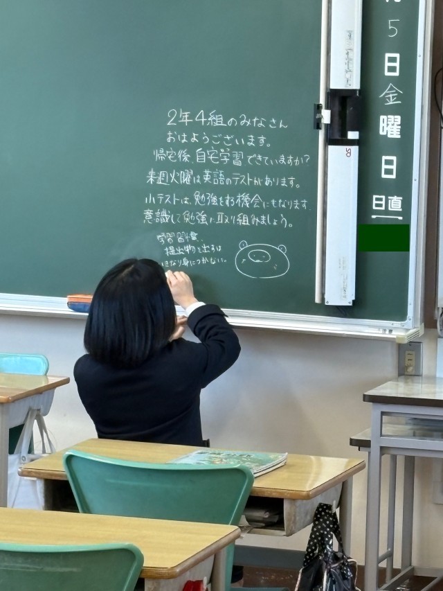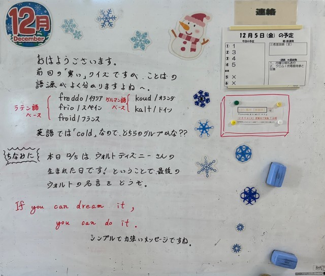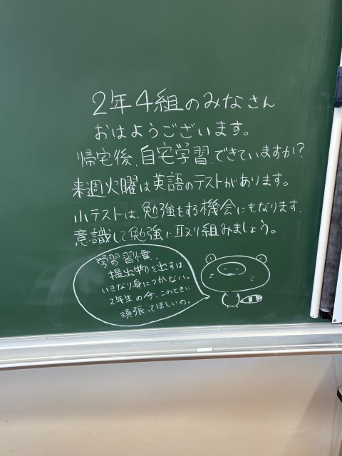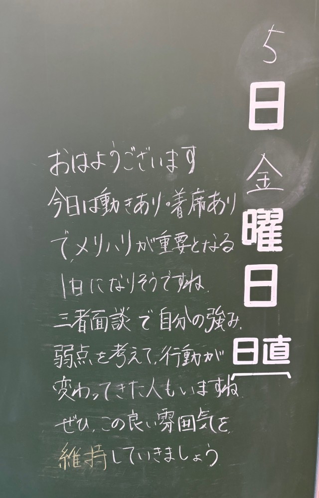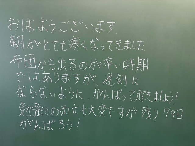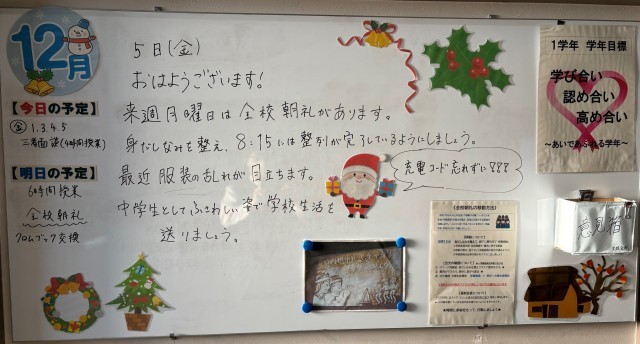 12月5日(金)の朝に校舎内を巡回していたら、学年主任や学級担任の先生からのメッセージが書いてありました。