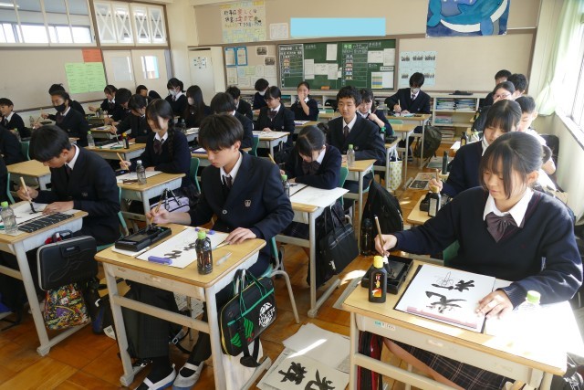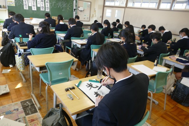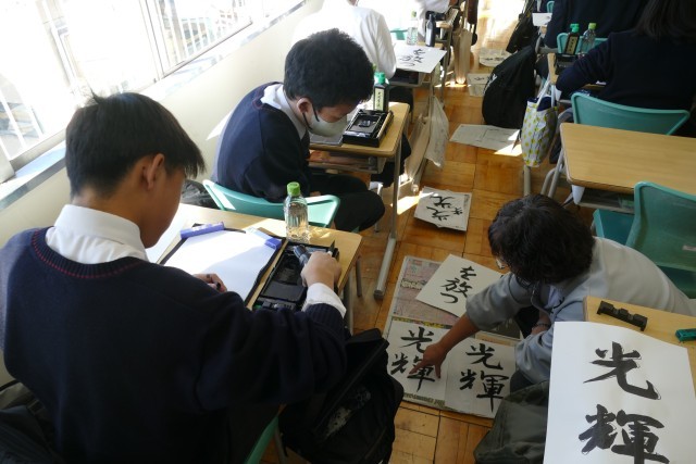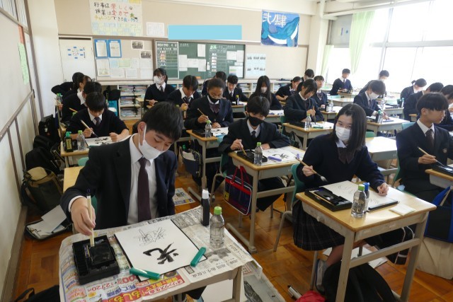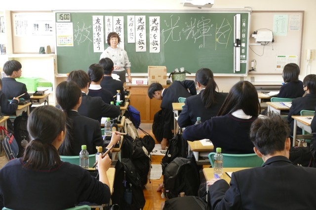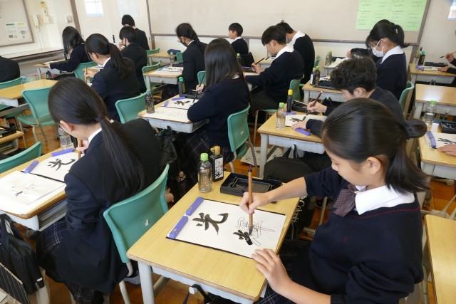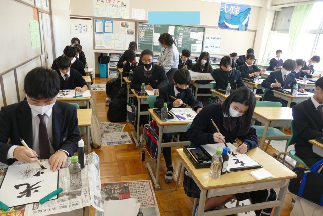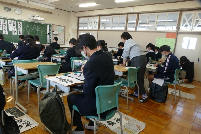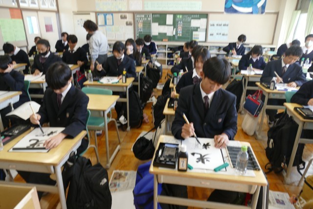 12月10日(水)2校時に2年生の教室で、国語科の藤原先生の書写の授業の様子です。書初めの書き方を学んでいました。生徒のみなさんは集中して、黙々と習字に取り組んでいます。みなさんとても上手です。