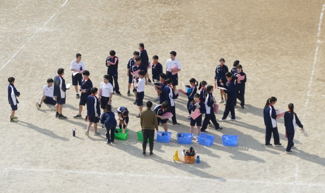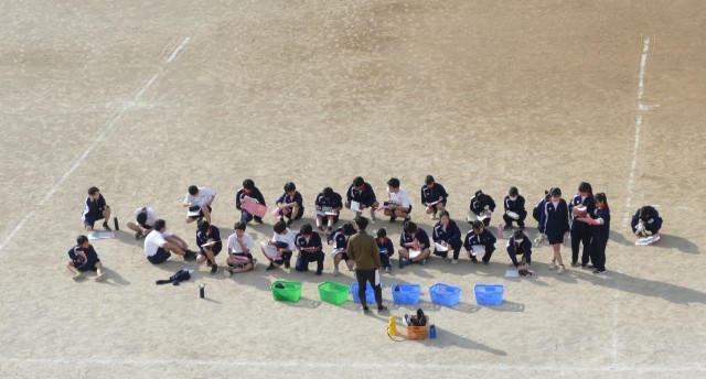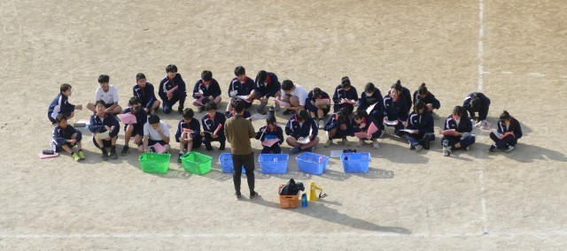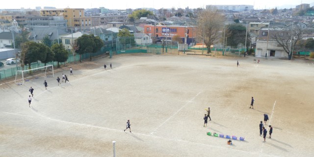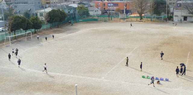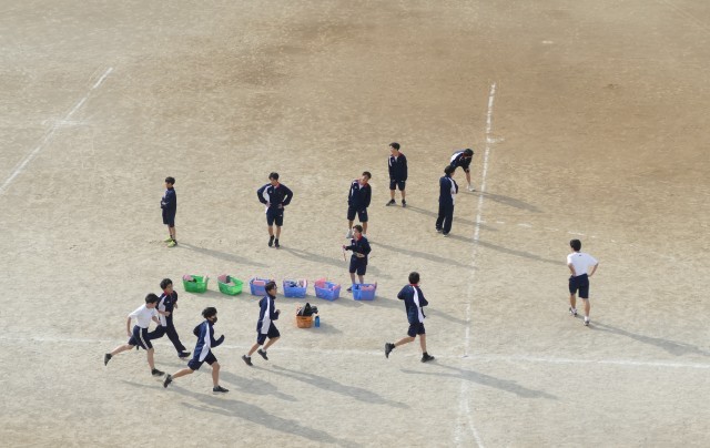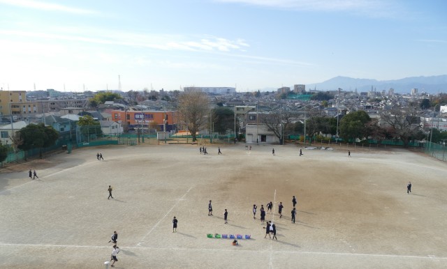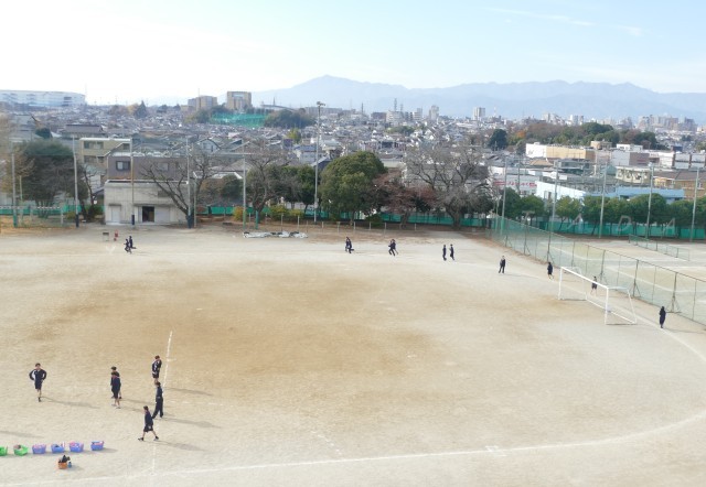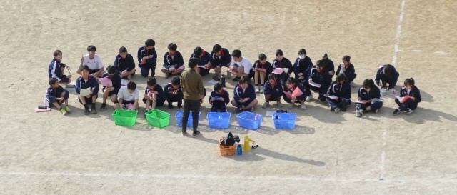 12月11日(木)2校時に校庭で、1年生のみなさんが片山先生の体育の授業に取り組んでいました。生徒のみなさんは、青空のもと一生懸命に走っていました。頑張ってください。応援しています。