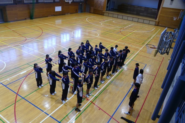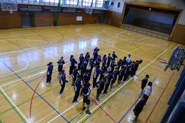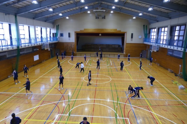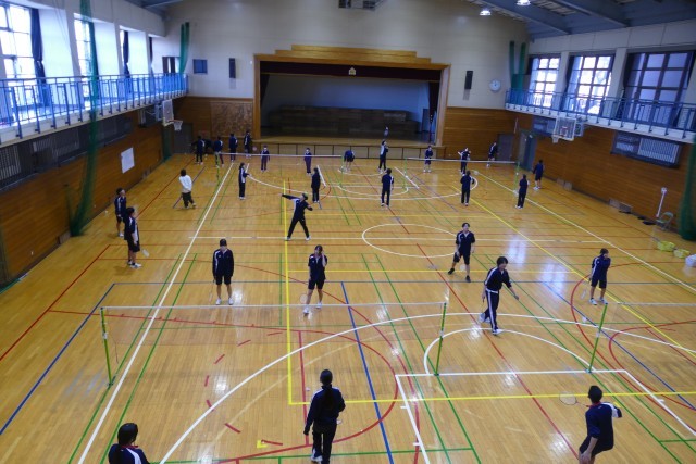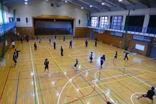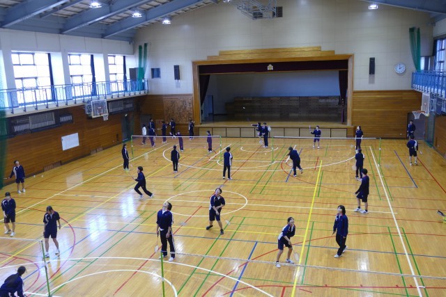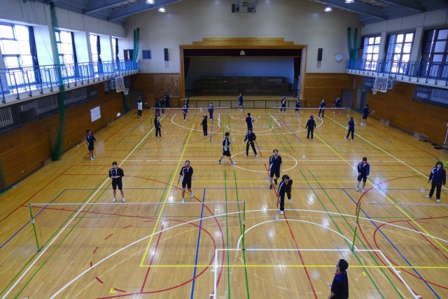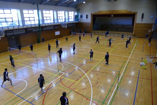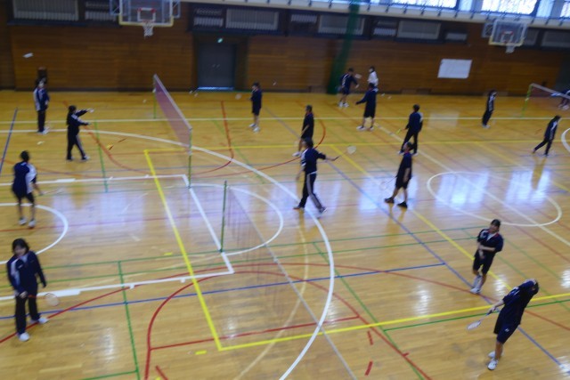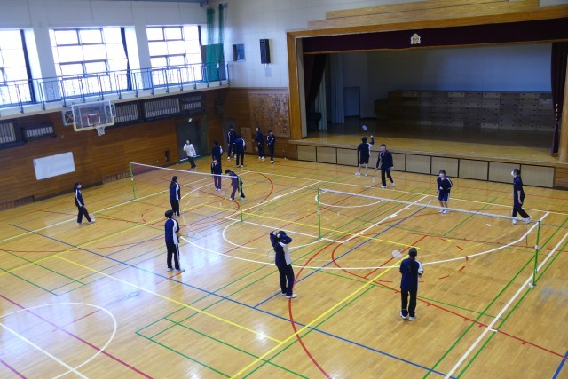 12月11日(木)5校時にアリーナで、3年生のみなさんが川崎先生の体育の授業に取り組んでいました。バドミントンをしています。生徒のみなさんは明るく楽しくプレーしていました。
