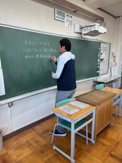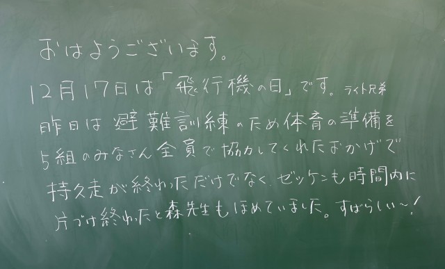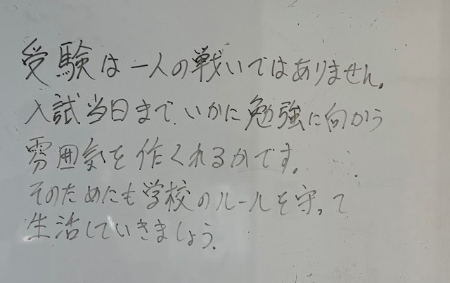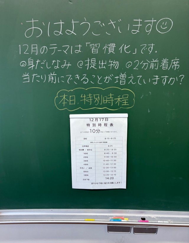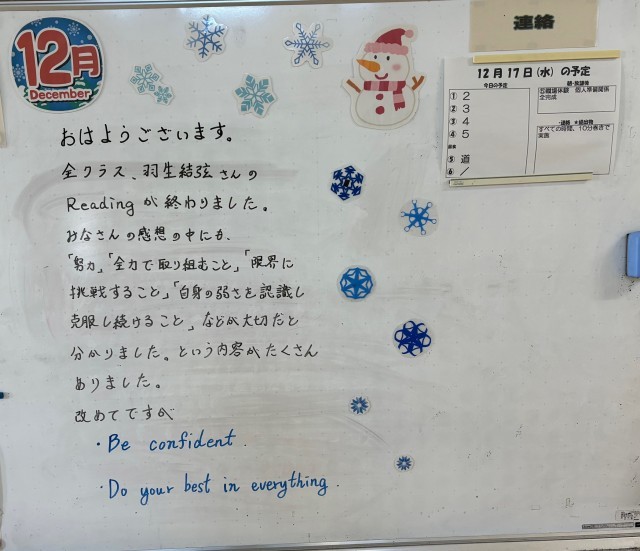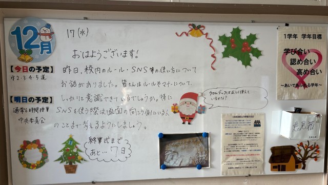 12月17日(水)の朝に校舎内を巡回していたら、学年主任や学級担任の先生からのメッセージが書いてありました。