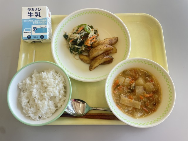 今日の給食のメニューは、ごはん、マーボー大根、ガーリックポテト、わかめ入り中華サラダ、牛乳です。