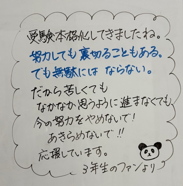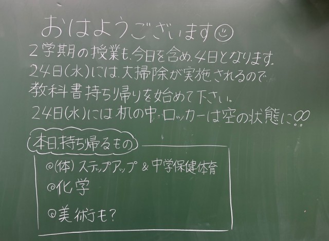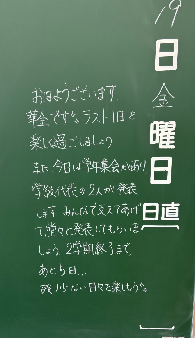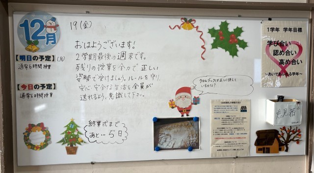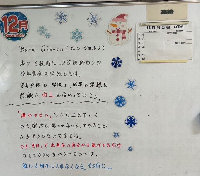 12月19日(金)の朝に校舎内を巡回していたら、学年主任や学級担任の先生からのメッセージが書いてありました。