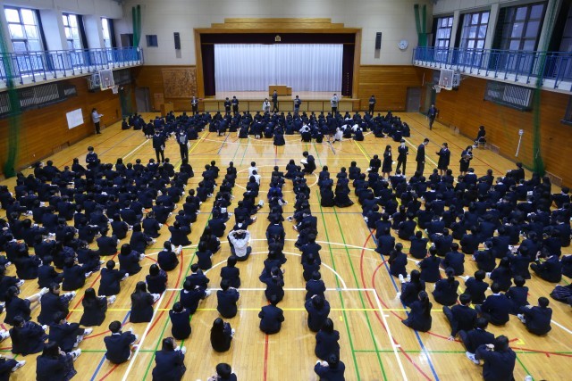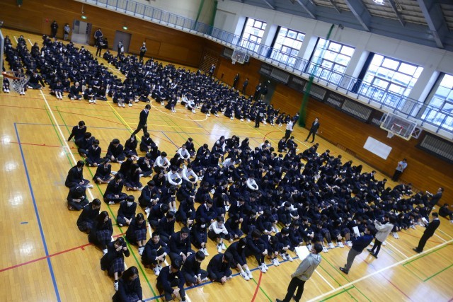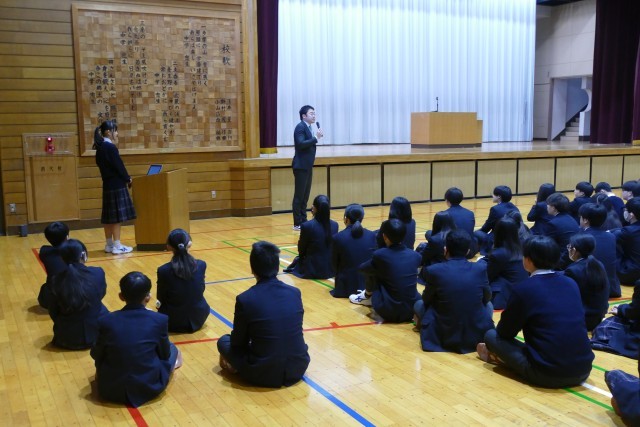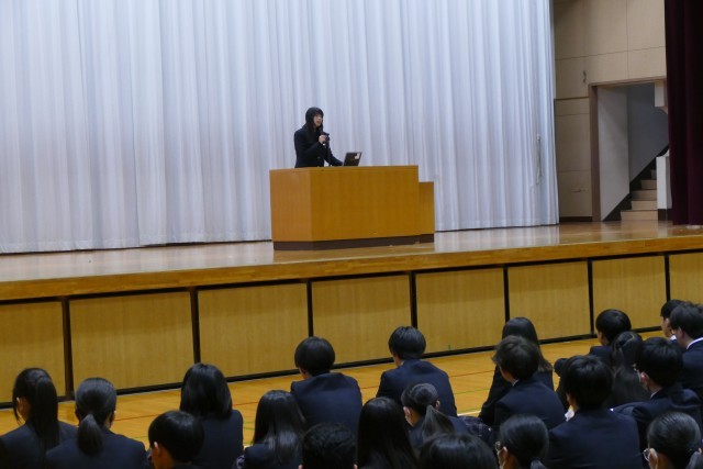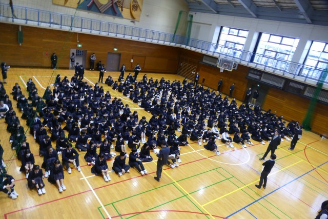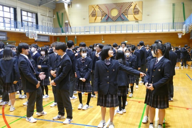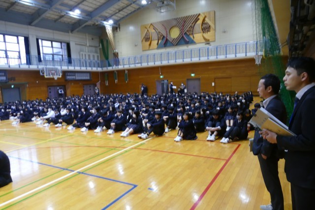 12月22日(月)8時25分からアリーナで生徒会朝礼を行いました。はじめに生徒会役員のKさんからは、生徒のみなさんが楽しく気持ちよく学校生活を送るために、「自分たちで決めた服装などのルールを守ろう!」と、お話がありました。生徒のみなさんは。はじめに自己点検してから、お友達とお互いに点検していました。次に保健委員長のWさんから、「健康な生活を送るために、手洗いや換気などを積極的に行い、インフルエンザ等の感染症の未然防止を図ろう!」と、お話がありました。最後に生徒会担当の鈴木先生から、「生徒会の自治活動に全校生徒で積極的に取り組み、自分たちで良い学校にしていこう!」と、お話がありました。生徒のみなさんは、真剣にお話を聞いていました。そして、2・3年生のみなさんがアリーナを去った後に、1年生のみなさんは学年主任の蔀先生から「正しい学校生活を送るために!」と、お話がありました。