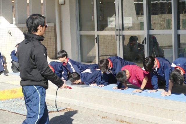 1月6日(火)に3年生の昇降口の前で、陸上競技部のみなさんが一生懸命に筋トレを行っていました。