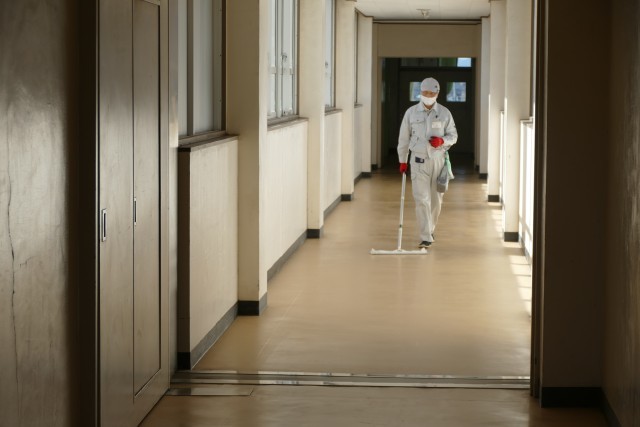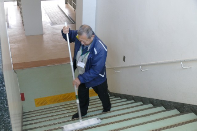 1月6日(火)に、用務員の神田さんと永堀さんが忠生中学校の廊下や階段を綺麗に掃除しています。ありがとうございます。影のヒーローです。
