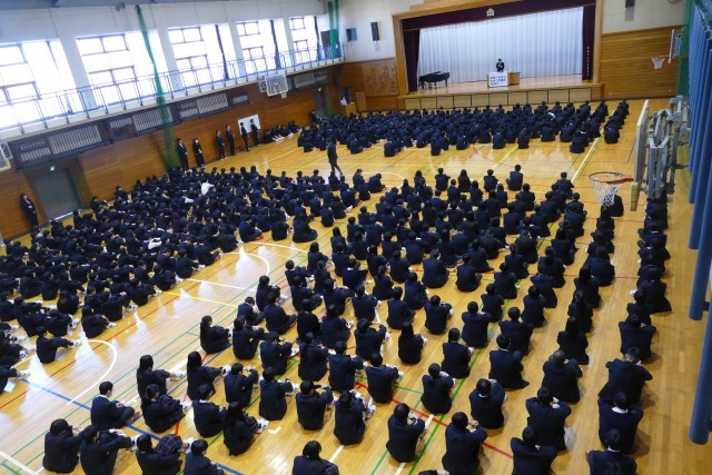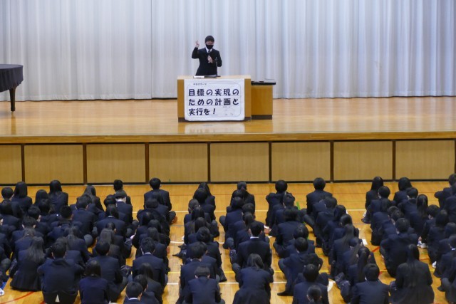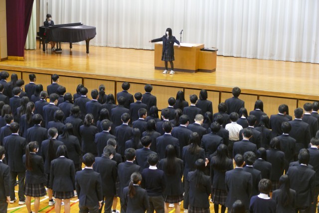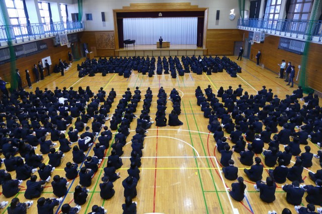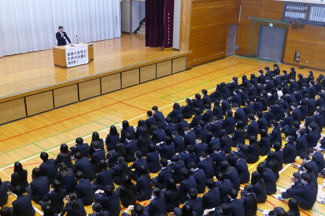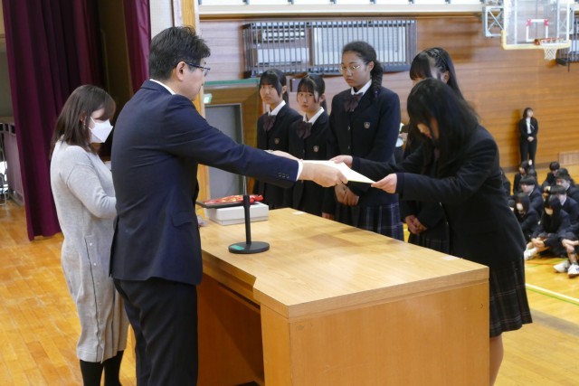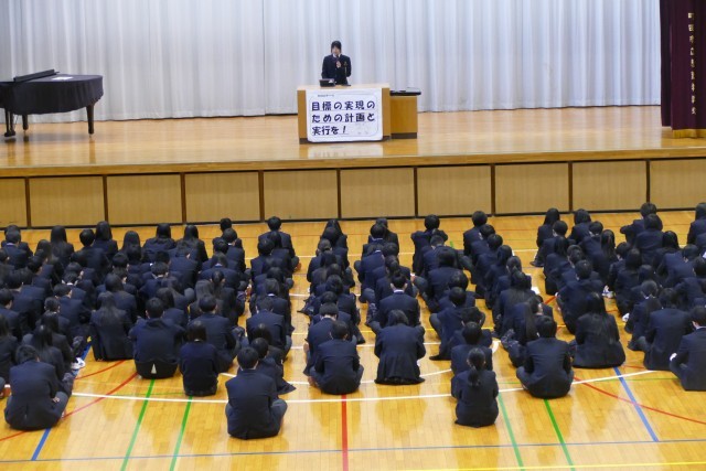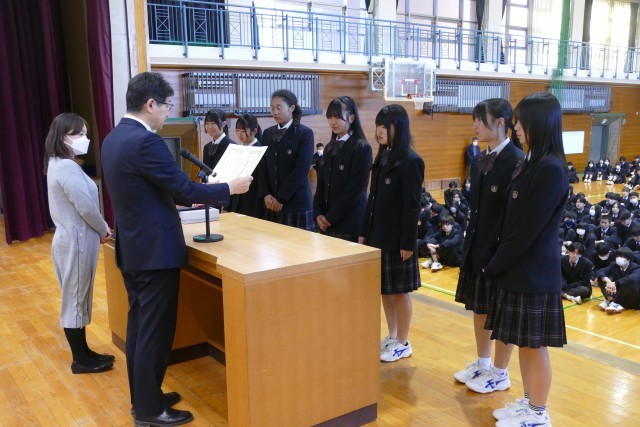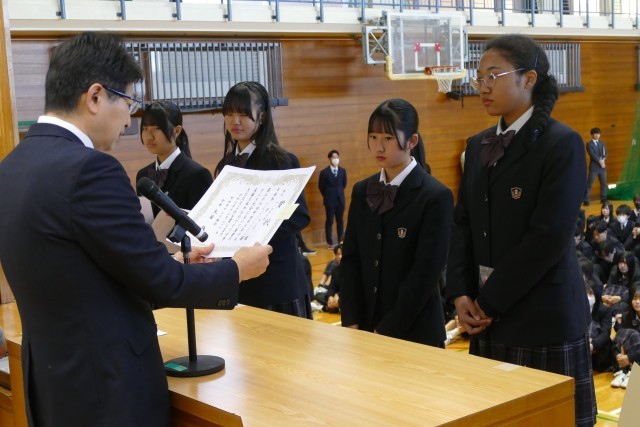 1月8日(木)9時からアリーナで3学期の始業式を行いました。はじめに校歌斉唱です。指揮をSさん、伴奏をHさんが立派に務めてくれました。次に校長先生から「目標の実現のための計画と実行を!」とのお話がありました。続いて、生活指導主任の小川先生から、「新年度に向けて、3学期は『①時間、②あいさつ、③服装』の3点についてしっかり取り組もう!」とのお話がありました。続いて、生徒会副会長のKさんから「2学期の振り返りと、3学期に向けて」の素晴らしいお話がありました。最後に硬式テニス部のみなさんの表彰を行いました。全校生徒のみなさんは、落ち着いて集中してお話を聞いています。聞く姿勢がとても良いです。この調子でまとめの3学期に「有終の美」を飾りましょう。