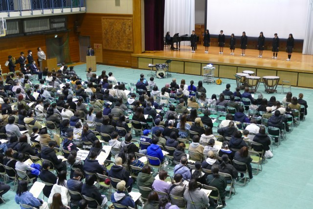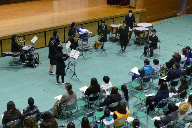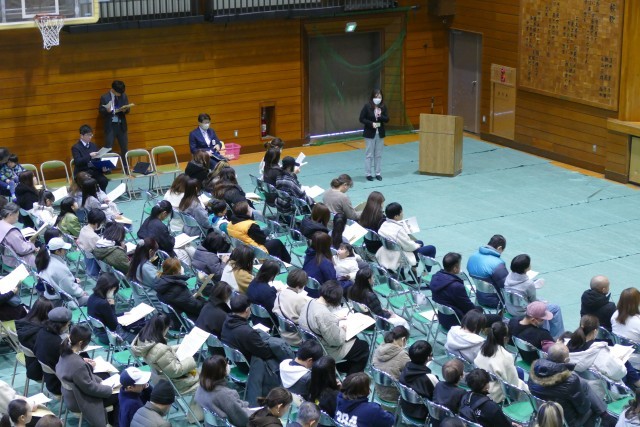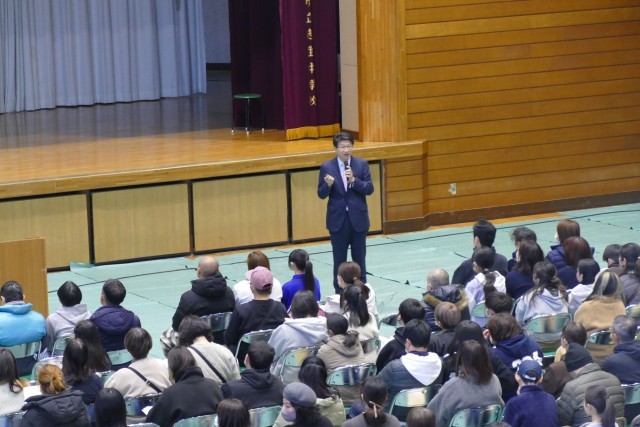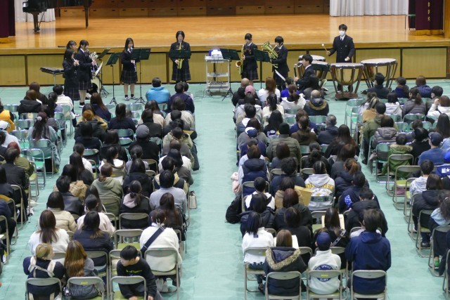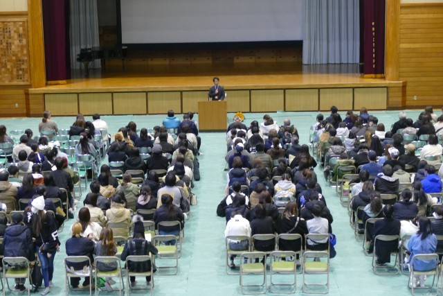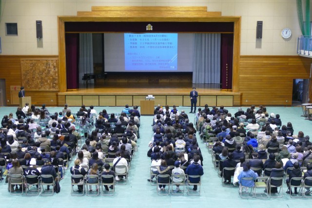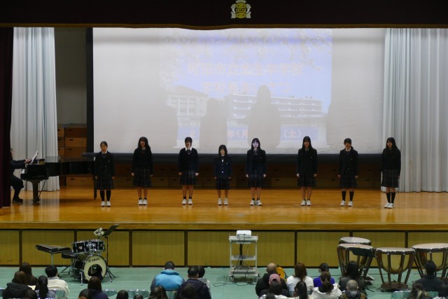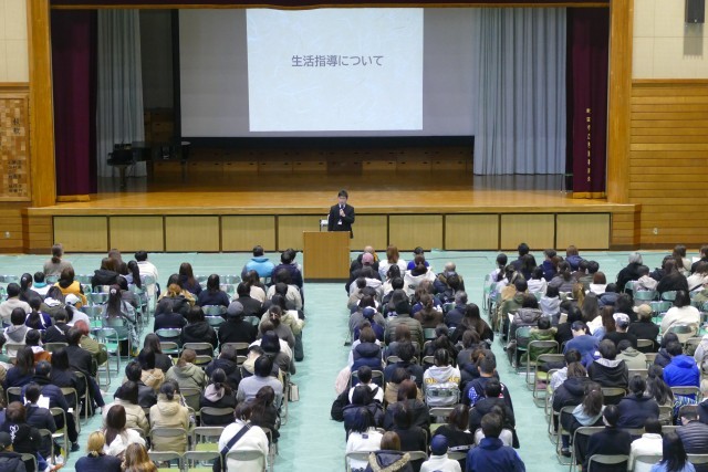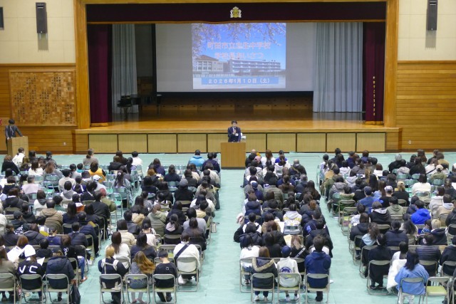 1月10日(土)11時50分からアリーナで新入生保護者説明会を行いました。はじめに合唱部のみなさんが忠生中学校の愛唱歌「未来へ届け」をとても美しいハーモニーで会場を魅了してくれました。次に、吹奏楽部のみなさんがアンサンブルコンサートでも演奏した「ロマネスク組曲」を披露してくれました。合唱部と吹奏楽部の素晴らしい演奏に会場からは大きな拍手が鳴り響きました。そして、校長先生からご挨拶があり、教務主任の常盤先生からは「学校生活」、生活指導主任の小川先生からは「生活指導」、9組主任の野崎先生からは「特別支援学級」についてのお話がありました。