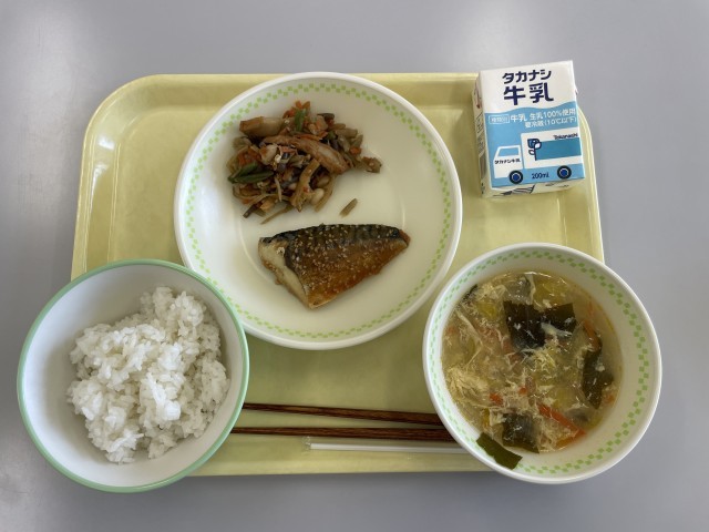 今日のメニューは、ごはん、さばのごまみそだれ、五目きんぴら、体温まるかき玉生姜汁、牛乳です。