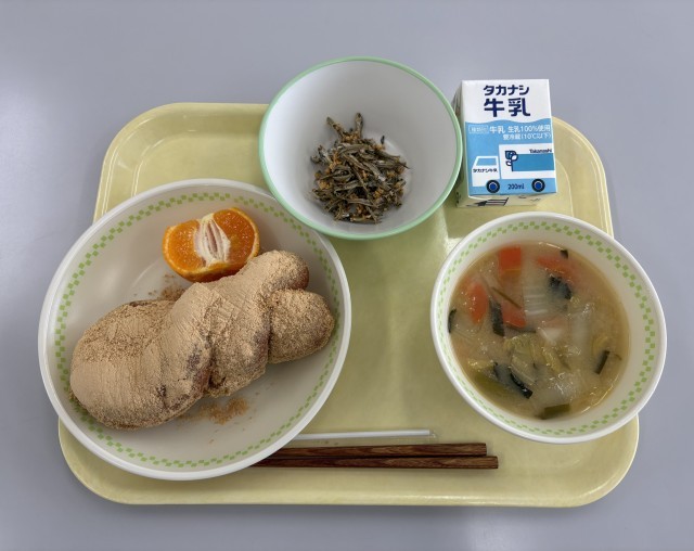 1月14日(水)の給食 公開日 2026/01/14 更新日 2026/01/14 今日の給食 今日の給食のメニューは、きなこ揚げパン、牛乳、いりこの甘辛和え、まち☆ベジと肉団子のみそスープ、ポンカンです。まち☆ベジと肉団子のみそスープがあたたかくてとても美味しかったです。ごちそうさまでした。