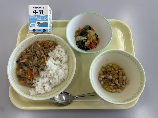 今日のメニューは、豚肉のスタミナ炒め丼、町田産白菜ナムル、おさつとお豆のごまがらめ、牛乳です。
