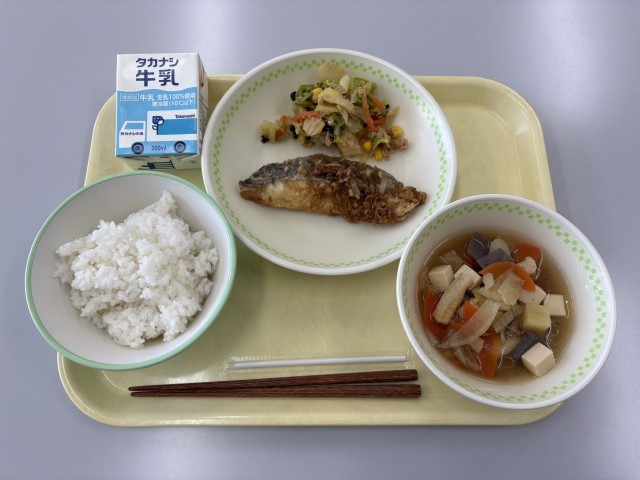 1月22日(木)の給食 公開日 2026/01/22 更新日 2026/01/22 今日の給食 今日の給食のメニューは、ごはん、牛乳、かますの南蛮漬け、町田産キャベツのツナ和え、けんちん汁です。今日の給食は全部おいしかったです。ご馳走さまでした。