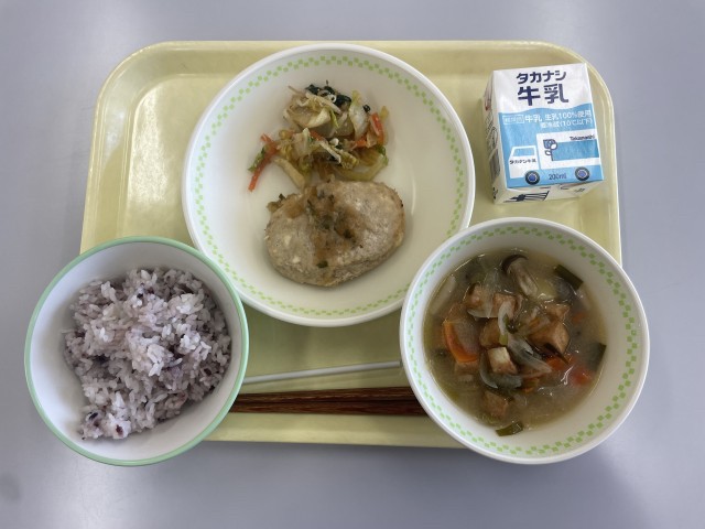1月23日(金)の給食 公開日 2026/01/23 更新日 2026/01/23 今日の給食 今日のメニューは、黒米入りごはん、町田産大根おろしバーグ、町田産白菜のごま和え、さつまいもと玉ねぎのみそ汁、牛乳です。
