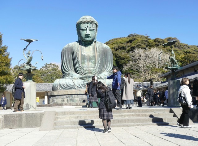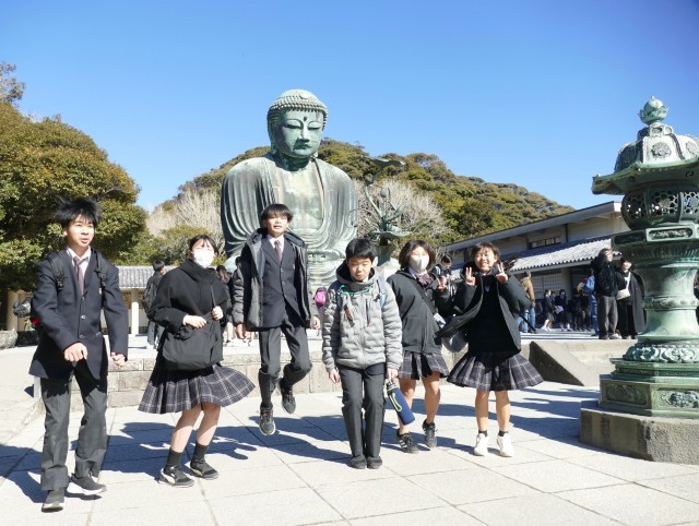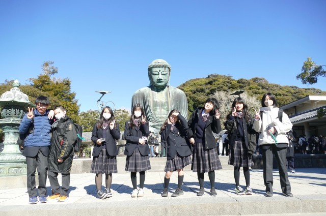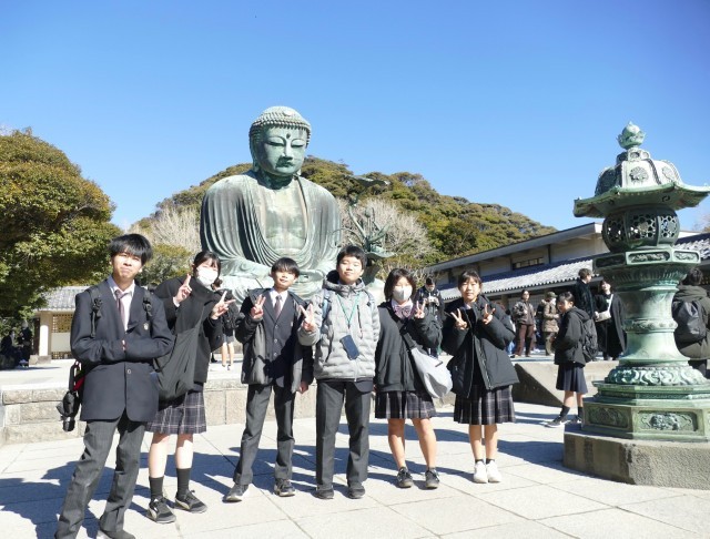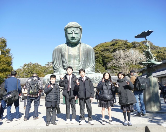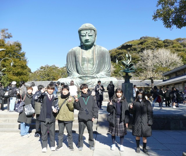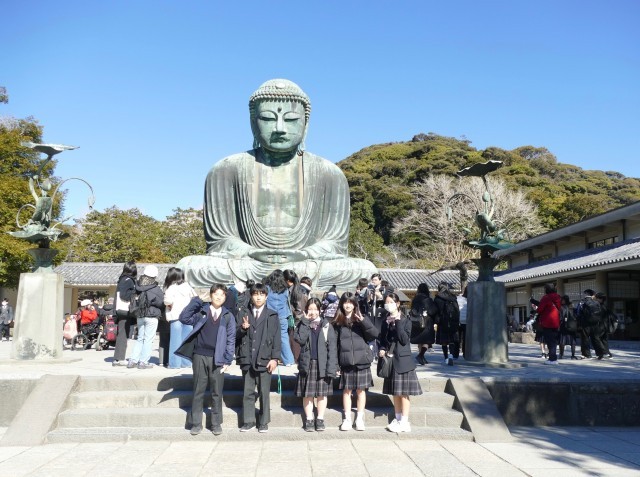青空のもと、鎌倉の大仏の前で班のみんなと写真を撮りました。大仏の大きさに驚きました。日本の歴史と文化に触れる貴重な体験をしました。