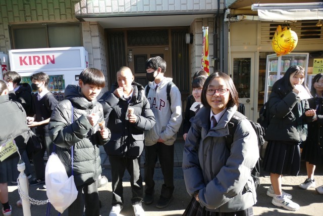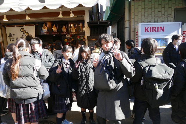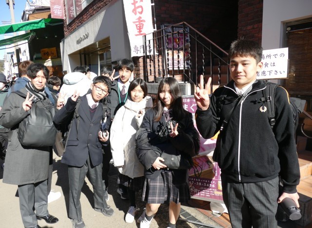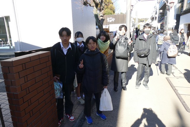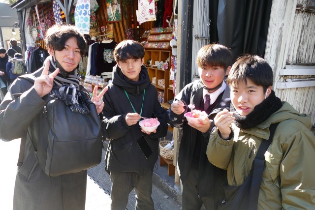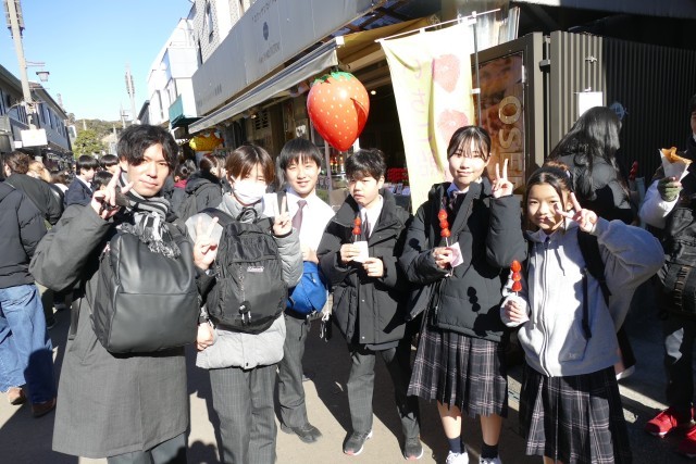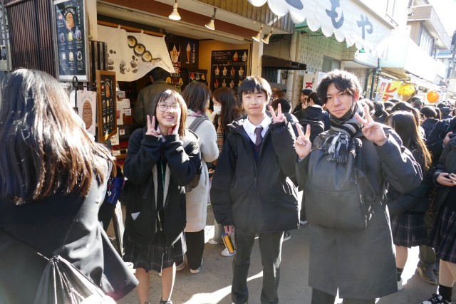 小町通りは多くのお店が立ち並んでいます。観光客の多さに驚きました。生徒のみなさんはお土産を買ったり、名物のお菓子を食べて楽しんでいました。学年主任の蔀先生と記念写真を撮りました。