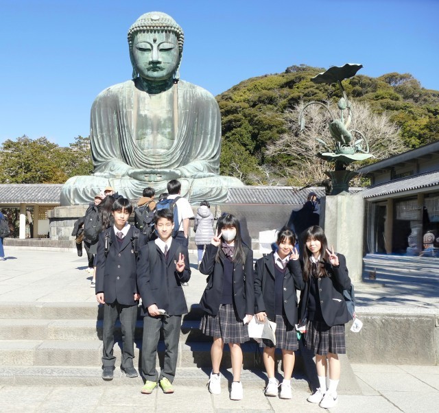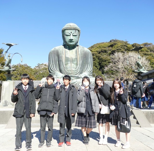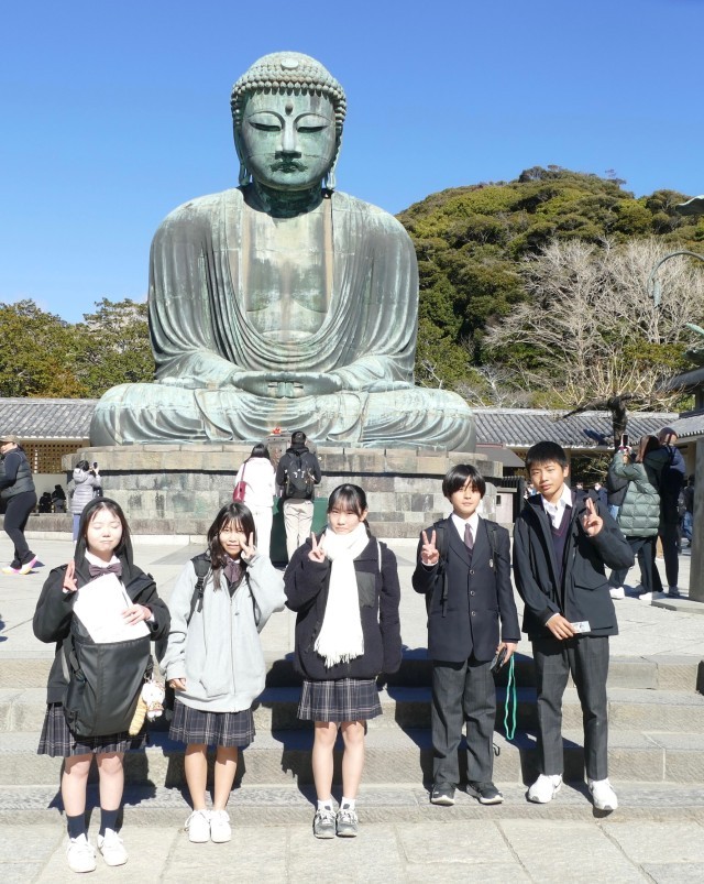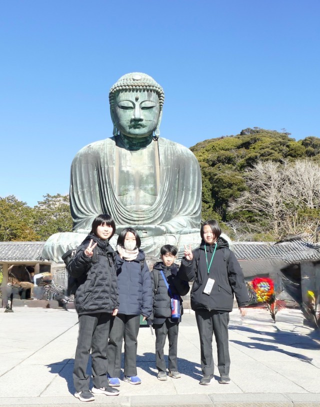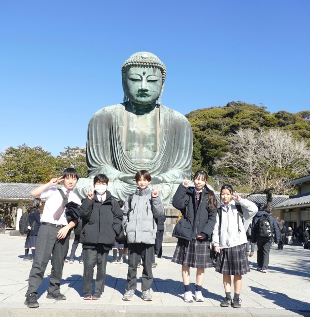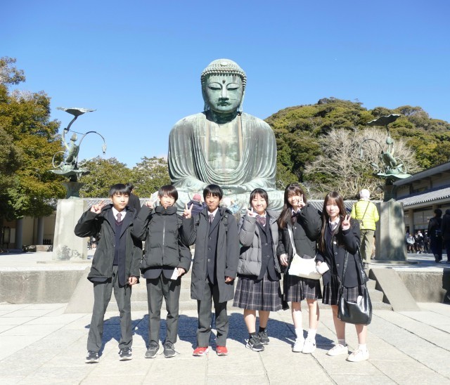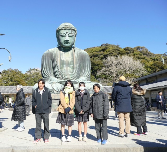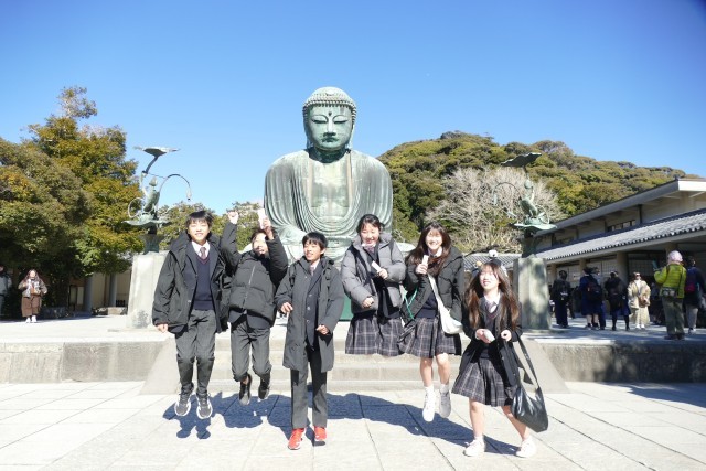 青空のもと、鎌倉の大仏の前で班のみんなと写真を撮りました。大仏の大きさに驚きました。日本の歴史と文化に触れる貴重な体験をしました。