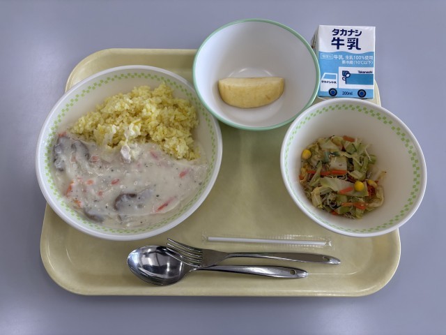 今日の給食のメニューは、ターメリックライスクリームソースがけ、牛乳、まち☆ベジとじゃこのサラダ、りんごです。ターメリックライスクリームとても美味しかったです。ご馳走さまでした。