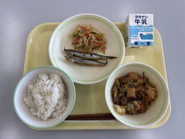 今日の給食のメニューは、麦ごはん、牛乳、まち☆ベジと生揚げの回鍋肉風、焼きししゃも、バンサンスーです。まち☆ベジと生揚げの回鍋肉風がとても美味しかったです。ご馳走さまでした。